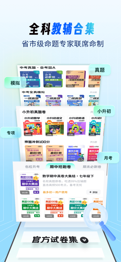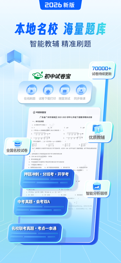 考霸试卷宝,五大核心优势,决胜每一张考卷!轻松赢定小初高每场考试! 刷题多却提分慢?模拟考总不理想?试卷堆积无从下手? 不是不够努力,而是用错了工具!考霸试卷宝,重新定义“有效练卷”,让你每张试卷都发挥提分价值。 拥有考霸试卷宝,就等于拥有了海量真题卷、智能组卷系统、名师精讲试卷、个性化错题复盘与考点音频库。只练必考卷,专注提分过程,助你考试一次比一次更强! 【 智能组卷,贴合本地考情】 基于本地化大数据,智能组合“真题卷、模拟卷、预测卷、阶段检测卷”,紧贴本地命题趋势,练一套抵十套。 【 海量真题,覆盖全场景】 涵盖百强名校月考、期中期末、联考竞赛、升学分班等真题试卷,随时下载打印,实战环境训练,考场自然不慌。 【试卷配套逐题精讲】 每套试卷配备名师视频解析,不仅讲答案,更讲思路、考法与陷阱,真正做到“做一套,会一类”。 【错题深度分析与同类题推荐】 自动生成错题报告,AI 定位薄弱环节,并推送同类型试题巩固训练,杜绝重复失分。 【考点音频随身听】 配套试卷相关考点音频,利用碎片时间巩固核心知识,记忆更轻松。 全设备兼容,多模式学习: 支持平板、学习机,可在线测试,也可无限次下载打印,满足课堂、家庭、自习全场景需求。 考霸试卷宝——不只是做试卷,更是把每张试卷变成提分台阶!