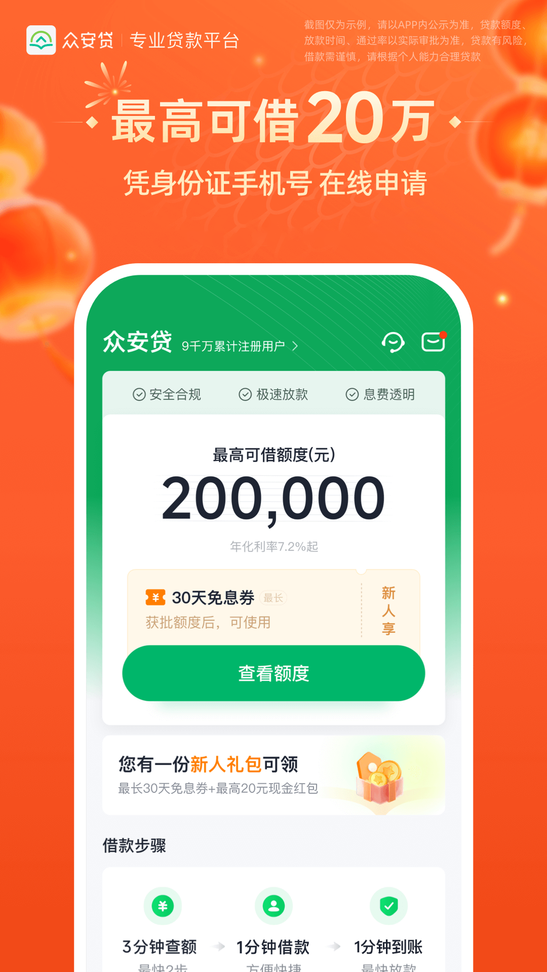 免责申明: vivo应用商店仅为信息发布平台,不对第三方发布的金融产品信息真实性及准确性负责,也不提供投资、理财、贷款等服务。vivo和金融产品之间不存在任何关系,不构成任何担保或承诺。提醒您使用此类应用时提高风险意识,勿将身份证号码、银行卡密码、验证码等敏感信息透露给第三方,如您通过vivo应用商店进入第三方网站或应用进行投资、理财、贷款等行为,由此产生的损失,vivo不承担任何责任。<br><br>众安贷是无抵押,纯线上消费信贷平台,专注为个人和小微企业主提供即时到账的贷款服务。基于成熟专业的风控能力对客户信用进行整体评估,3步借款上限高达20万,平均1分钟放款。<br><br>【产品优势】<br>1、贷款额度高:<br>额度上限高达20万,一次授信,循环可用(以实际审批为准)<br><br>2、还款息费低:<br>贷款日息0.02%起,支持多种还款途径;<br>3、放款速度快:<br>快至5秒起到账,自动审批,极速放款;<br>4、还款周期长:<br>限长可借12期,分期灵活(6期、12期灵活选择);<br>5、借款门槛低:<br>0抵押,凭身份证即可申请;<br><br>6、安全借款:<br>个人信息全程加密,为您提供安全保障。<br>【联系我们】<br>客服电话:400-601-9266 周一至周日 9:00-18:00