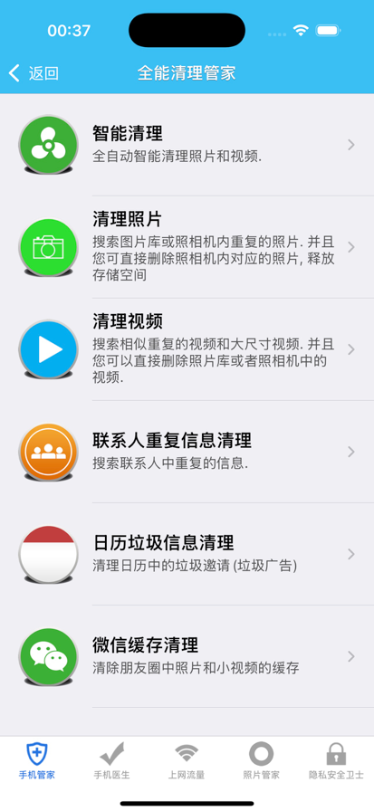 超级手机管家是一款根据iOS系统各项功能和特性开发的一体式的手机助手/Pad管家应用,包括网络流量监控, 设备侦测, 手机清理大师, 手机充电管家, 全能照片管家, Safari浏览器广告拦截, 多种主屏幕和锁屏界面小组件, 隐私安全管家等实用功能,包括以下主要功能: - 全能手机清理管家(一键智能清理,重复照片视频清理,重复联系人信息清理,日历垃圾信息清理) - 全能网络管家(网络流量监控,网络设备扫描防蹭网,网络测速, Safari浏览器广告拦截) - 硬件监测(蓝牙设备查找Air Finder,磁盘空间监控,动态内存监控,噪音分贝仪,GPS海拔表,气压计,高度计,屏幕坏点检测) - 全能照片管家(GIF动图和Live Photo实况照片制作,照片EXIF信息查看器,修改或删除照片GPS定位信息,桌面自选照片小组件, 照片压缩节省磁盘存储空间) - 手机充电管家(精美的充电界面显示,充电完成提示,手机主屏幕直接启动充电动画),让手机充电不再枯燥 - 全方位隐私安全管家(隐私照片,视频,录音,通讯录,笔记,文件,个人密码) - 多功能桌面小组件和锁屏小组件(翻页时钟,LCD时钟,石英钟,多功能启动中心,显示自选照片) - 微商朋友圈防折叠输入法等实用功能 - 倒数日: 记录重要的日子 - NFC读写器 - 二维码和条形码扫描,扫码记录管理器 - 系统信息查询: 包括设备名,CPU,内存动态信息,磁盘使用度,网路IP地址信息等 - 支持Apple Watch - 以及更多实用的功能,请您参阅详细功能介绍... 让您随时随地了解iPhone,iPad的信息,解决各种使用中遇到的不爽,保持您的设备一直处于最优状态,让您愉快的玩转iPhone,iPad! * * * * * * * * * * * * * * * * * * * * 详细功能介绍: • 全能网络管家 - 上网流量监控, 每日流量使用情况,月流量使用分布图, 可设置流量套餐:套餐总流量,校准已使用,月结日 - 网络设备扫描(防蹭网): 发现连接到您的网络的所有设备识别潜在的安全威胁或未经授权的用户, 用于防止未知设备蹭网 - 网络测速: 精确测量您的真实网速。将您的结果与全球和本地平均值进行比较。跟踪您的速度随时间的变化,以确保您得到所支付的费用. 最大支持1000M宽带 - 网络设备信息: 查看有关您的网络和已连接设备的详细信息, 包括设备蜂窝网络IP地址, 设备Wi-Fi IP地址, Wi-Fi路由器IP地址,内网IP地址, 外网IP地址, 网络瞬时流量. - Safari浏览器广告拦截: 使用Safari浏览器浏览网页时, 帮您拦截大部分的网络广告, 提高您的上网的体验. • 硬件管家 - 蓝牙设备查找Air Finder: 同时查找多个蓝牙设备, 包括无线耳机和蓝牙音箱等. 保存已查找到的蓝牙设备信息, 方便下次查找. - 磁盘空间监控: 可分别显示出手机中的音乐,图片,视频所占空间和数量方便您管理手机 - 动态内存监控 - 噪音分贝仪: 实时侦测分贝数据 - GPS海拔仪和气压计: 显示海拔高度,气压数据,经纬度和指南针 - 二维码和条形码扫描: 直接扫码或者从相册导入图片进行扫码识别,支持多种二维码/条形码类型,内置扫描信息管理 - 屏幕坏点检测: 屏幕多点触控检测, 屏幕彩条测试, 屏幕灰阶测试, 屏幕可控区域检测 - NFC读写器:读取NFC标签数据,创建数据并写入NFC标签 • 全能手机清理管家 - 一键全自动智能清理重复的照片,GIF动画, Live Photo实况照片,重复的视频和屏幕截图 - 重复照片检测,扫描手机图片库,运用多种图形比对算法,不但能检测出重复的照片,更重要的是能检测中相近的照片,并删除重复照片. 方面您更好的管理手机图片库中的照片,节省系统存储空间, 您给试一下 (^_^) - 检测并删除重复的视频. - 联系人重复信息检测, 检测重复的联系人,电话和电子邮箱信息 - 日历垃圾信息清理,清理日历中的垃圾邀请(垃圾广告) • 主屏幕小组件 - 主屏幕小部件包含一个仪表盘,可以非常轻松地查看设备状态和网络信息 - 主屏幕小部件包含多种时钟样式,您可以根据自己的喜好将其添加到主屏幕 - 主屏幕启动中心 1.快速打开社交网络,包括微信,微博,Facebook,Twitter等, 设置联系人拨号或通讯信息,一键呼叫FaceTime,快速发送信息或电子邮件 2.设置地理位置,一键打开对应地图上的位置 3.设置网站链接,一键打开对应的网站 - 主屏幕显示自定义照片 - 主屏幕显示磁盘空间信息 • 锁屏界面小组件 - 锁屏界面显示磁盘空间信息 - 锁屏界面显示网络信息 • 手机充电管家+电池省电 - 全自动手机充电动画, 当您的iPhone或iPad连接数据线或进行无线充电的时候, 应用将自动启动并显示充电动画. - 手机充电界面: 显示漂亮的充电界面,多种主题可供选择,同时支持更换自定义壁纸,让设备充电不再枯燥 - 充电完成提示 - 充电夜间免打扰模式 - 手机电池省电攻略 • 照片管家 - GIF动图制作,通过动图编辑器调整播放效果. GIF动图最长生成40秒 - Live Photo实况照片制作, 锁屏界面预览功能,设置Live Photo实况照片封面 - 设置Live Photo动态壁纸: 内附操作说明,教您如何把生成的Live Photo实况照片设置为iPhone锁屏界面,实现在锁屏界面显示动画.同时支持Apple Watch! - 照片信息查看器, 可查看照片参数包括摄影器材, 拍摄参数, 图片处理参数等, 并支持不带照片参数(EXIF)的照片分享功能, 保护您的照片的隐私 - 修改或删除照片GPS定位信息 - 照片压缩节省磁盘存储空间 • 隐私安全管家, 最大化保护您的隐私 - 添加隐私加密保护的图片,拍摄照片,录制视频,录制语音,通讯录,笔记,文件和个人密码,确保您的个人信息数据安全