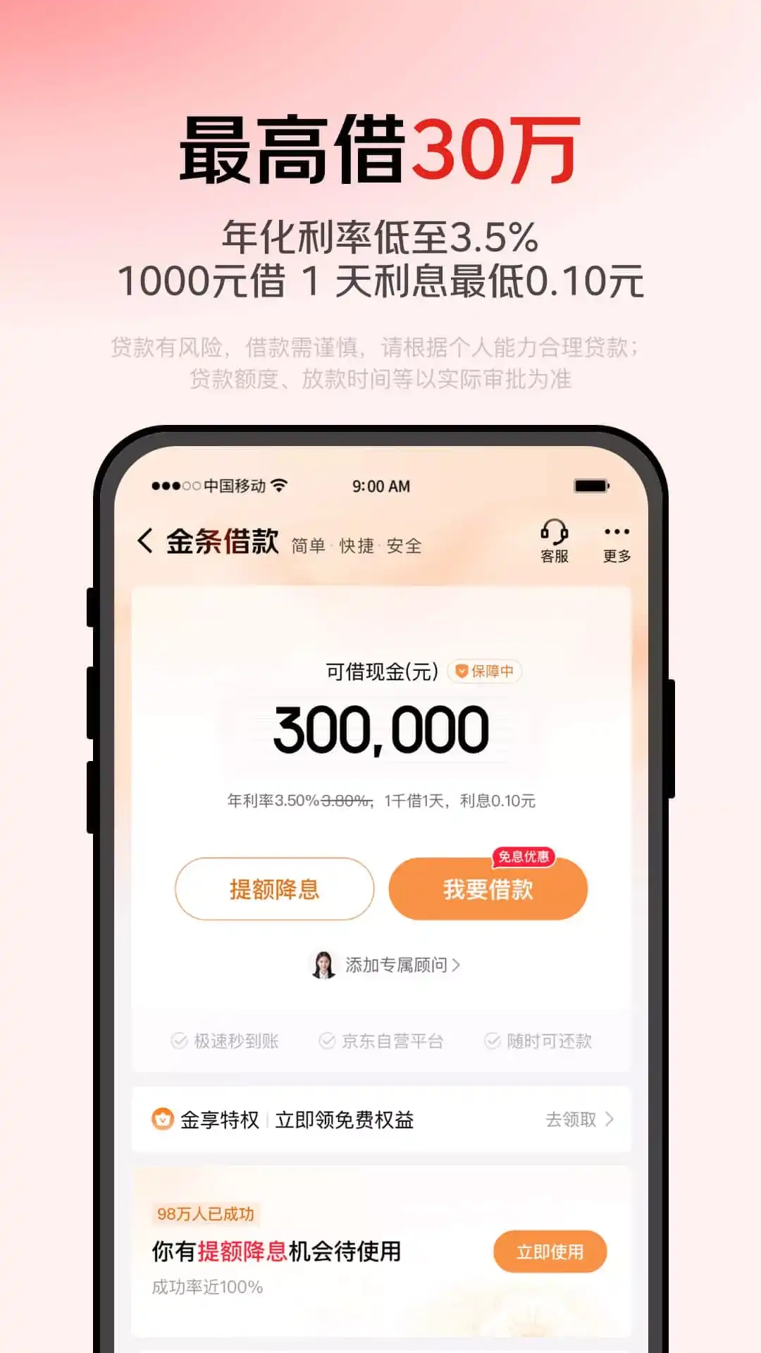 京东金融以智能化、内容化为核心能力,与银行、保险公司、基金公司等金融机构,共同为用户提供专业、安全的个人金融服务。 在这里你可以: 1、 理财:小金库、明星基金、黄金积存金等品类齐全,兼顾风险谨慎理财 2、 保险:医疗险、意外险、人寿险、重疾险、车险等,用心严选好保险,全方位守护家人 3、 借贷:京东金条借款服务年化利率3.9%-24%(单利),京东白条先消费后付款,适度消费开启信用生活 4、生活服务:每日来省钱频道领福利,使用积分兑换白条还款券、支付券、话费券、京东外卖券 【风险提示】 借款额度、分期期数及具体利率以实际审核为准,请根据需求合理借贷,理性消费,避免逾期 温馨提示:投资有风险,入资需谨慎,产品历史业绩情况仅供参考