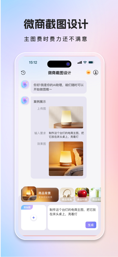 微商截图设计 - 聊天做图营销 专为微商卖家打造的移动商品图设计神器。无需专业技能,一部手机即可快速制作高点击率的商品主图与营销海报,让销量起飞。 AI智能背景替换: 一键移除杂乱背景,秒变纯色、场景图,轻松制作白底图。 独家视角与材质切换: 无需重拍,即可模拟不同拍摄角度和产品质感,全方位展示商品细节。 高效组图与海报编辑: 模板化制作商品组图、替换图片、增删元素,快速生成专业营销素材。 无论是服装、美妆、数码还是家居卖家,当你需要快速出图、提升商品质感时,这里就是你的移动摄影棚和设计工作室。 停止为作图烦恼,把时间留给生意。立即下载,让你的商品图脱颖而出! ************************************************************************ 微商截图设计 会员说明 订阅服务: 1:微商截图设计周会员 (1周) 2:微商截图设计年会员 (1年) 3:微商截图设计永久会员 (永久) 4:微商截图设计月会员 (1月) 订阅价格: 1:连续包周,价格为(18元/周) 2:连续包年,价格为 (108元/年) 3:永久会员,价格为(128元/永久) 4: 连续包月,价格为(38元/月) 关于自动续费说明: 使用权限:本会员公支持苹果端使用; 付款:确认购买,即从苹果iTunes账号扣款; 续费:到期前24小时,苹果自动从iTunes账号中扣费并延长会员期; 取消续订:如需取消续订,请在肖前订阅到期24小时以前,手动在iTunes/Apple ID设置管理中关闭自动续费功能; 关于使用次数:每个苹果ID只能免费试用一次; 关于退费:本软件不接受无理由退费,请用户谨慎购买; 会员续费协议:http://47.109.150.99/monthly 隐私政策:http://47.109.150.99/privacypolicy 用户协议:http://47.109.150.99/agreement 使用 微商截图设计 即表示您同意我们的协议和政策! ************************************************************************