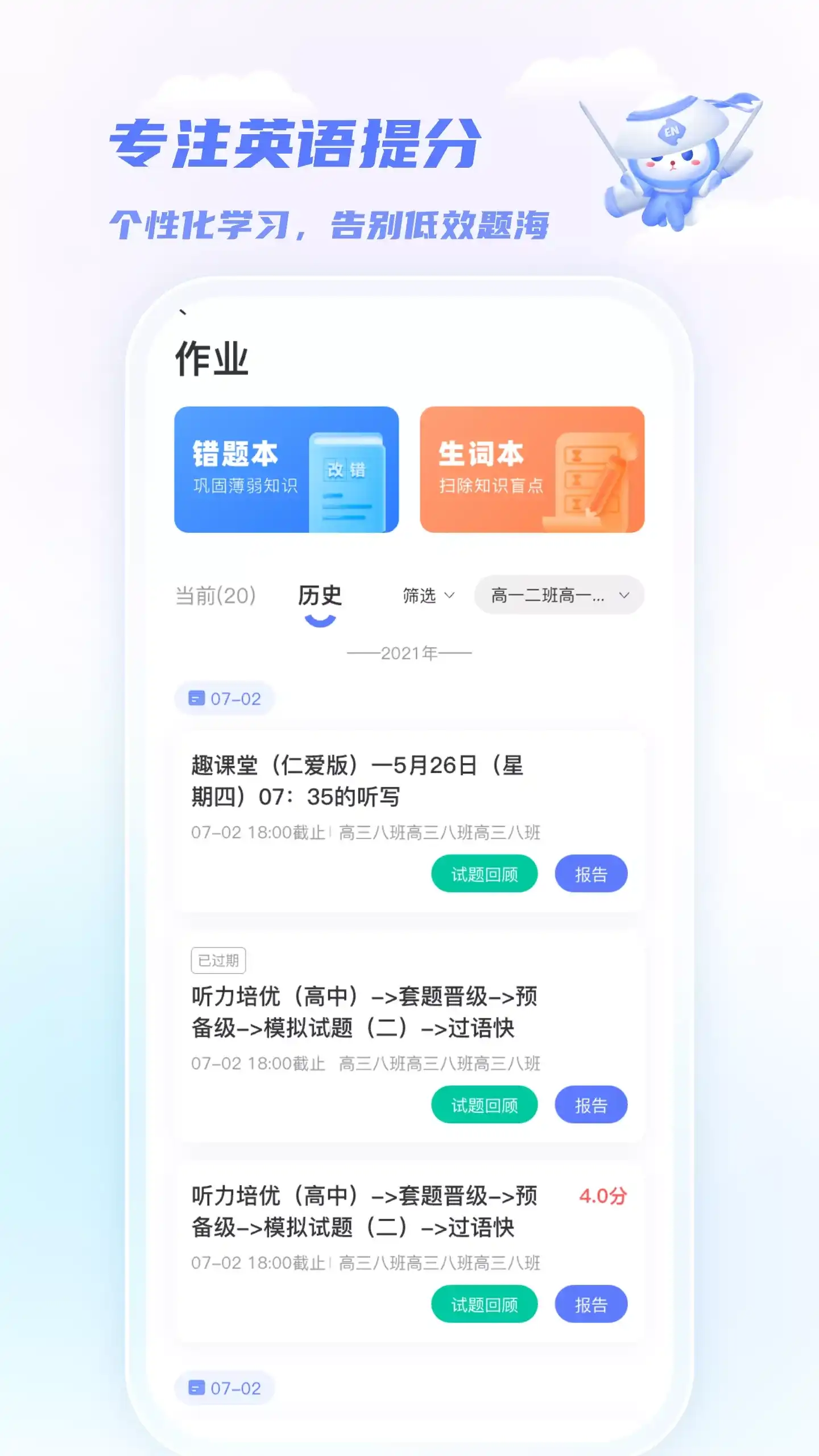 一起中学是一起教育科技推出的以大数据为驱动的学校智能教育平台。一起中学学生端是专为中学生研发的在线学习APP,以练习为纽带,同步学校教学进度,提供匹配学科能力的素质教育内容,通过大数据和人工智能等前沿技术,帮助学生减负增效,成为学校教育的有益补充,并实现中学阶段全学段、双学科覆盖。 产品特色功能 【查收练习通知】 及时查收老师推荐练习的通知,英语、数学在线做,手机完成,随时随地,快速方便; 【错题本】 贴心“错题本”功能,自动收集错题记录,类似题型练习,巩固知识点,摆脱一错再错; 【提分页】 排查薄弱,逐个击破,及时巩固,踏实攻克,高效练习。 【科学护眼】 合理使用电子产品,全方位养成良好习惯 学生端根据学习时长定时弹出护眼提示,提醒学生休息眼睛、做眼保健操,更有强制提醒护眼模式,进一步保护孩子视力健康。 一起中学-学生端怎么使用? 1.一起中学-学生端要有老师给的老师号才可以加入班级,加入班级后才能使用各项功能; 2.注册一个学生账号,输入自己的名字,根据老师给的号码,加入自己所在的班级; 3.打开一起中学,点击“待完成练习”,开始完成老师布置的各项练习; 4.完成练习后,可以查看自己的练习记录和练习完成情况。 如果您在使用的过程中,有任何问题,可以联系我们哦。 一起教育科技客服电话:400-160-1717
