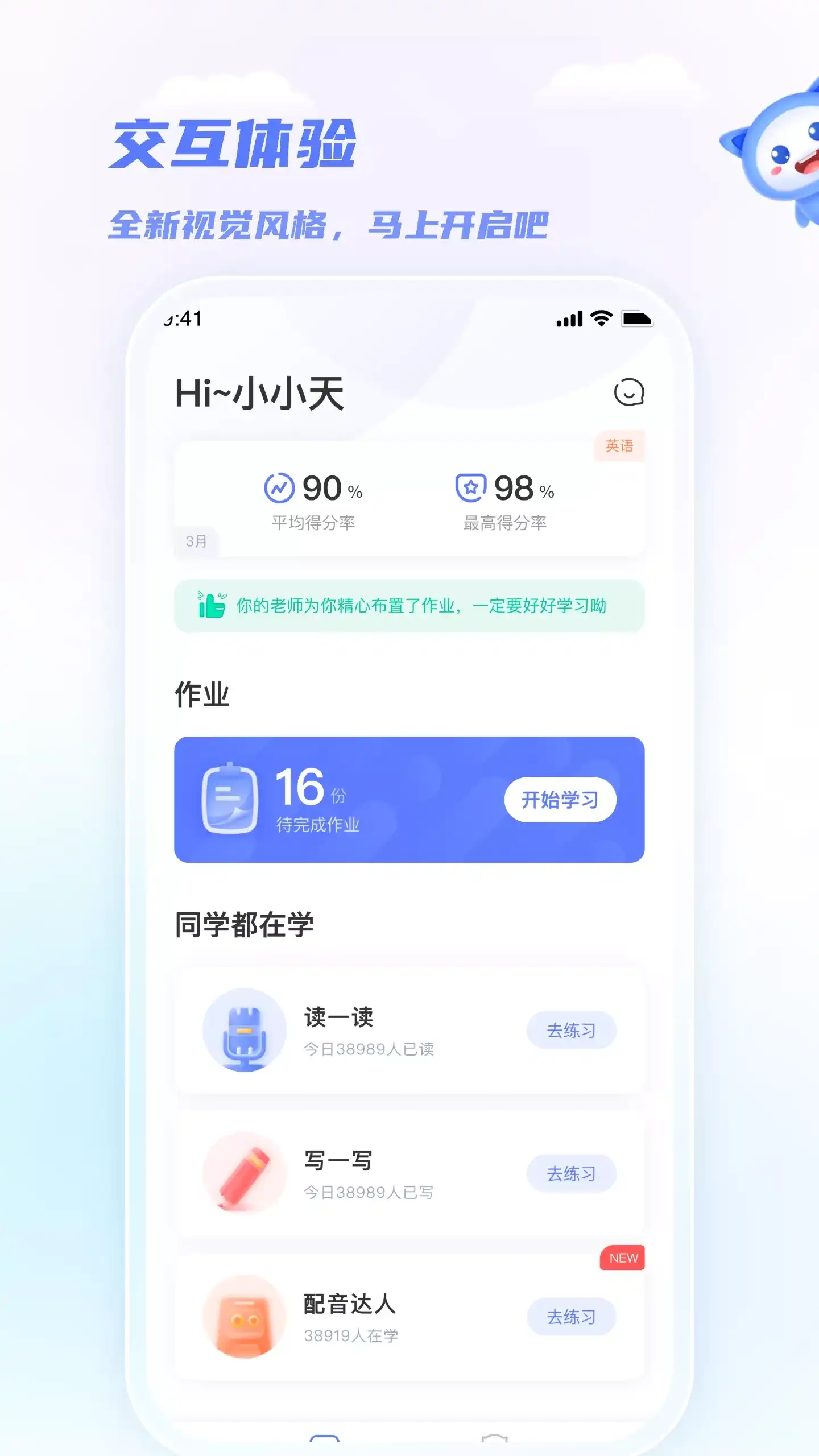 本产品为天学网旗下的学生端APP,为您提供人机交互、智能实时评分、学习数据智能分析、直播互动、展示投票等众多功能。将课堂放进你的口袋,使教和学更加人性化、智能化。此外客户端还支持天学网旗下众多经典产品在线或离线使用。 特色产品: 【读一读】 每天一句英文读一读,并由人工智能实时打分,随时随地口语练习,让自己每天进步一点。 【写一写】 每天一条翻译写一写,并由人工智能实时打分,随时随地翻译练习,让自己每天进步一点。 【配音达人】 摆脱枯燥传统的学习方式,通过为英语短视频配音的方式,让学生轻松又好玩地练习和提高英语口语。来这里秀出你流利的口语,展示你的配音才华吧。 公司简介:天学网,一家扎根于北京中关村的高新技术企业,致力于以人工智能技术驱动英语教学的数字化变革。以“AI+教育”为核心,依托创新研发的天学大模型,构建智能教学平台、数字化工具和高品质资源的英语学科教学新生态。