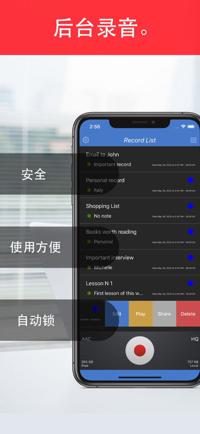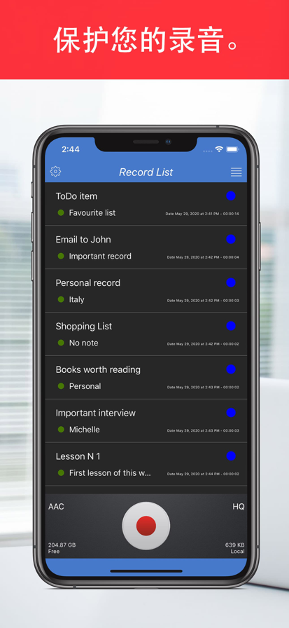 录音专业版满足您所有的录音需求,帮助您更高效的工作,包括高品质录音、快速播放、AI智能文件管理、多功能专业剪辑、快速一键共享等功能让录音更专业。 强大的录音模式: • 正常录音 轻松一键开启专业录音,稳定后台运行让您录音更安心。 • 定时录音 可预设开始录音的时间与结束录音的时间,让您合理安排录音时间并且轻松管理录音。 • 混合录音 可选择音频与录音混合录制。 • 只在说话时录音 专业的声控录音模式,只在您说话的时候录音,在低于指定分贝时自动暂停录音,自动优化录音文件大小。 • 蓝牙耳机录音 通过AirPods开启硬件主动降噪录音。 专业音频编辑: • 多段式音频剪辑 • 音量调节 • 音调调节 • 速度调节 • 插入新音频 • 混合音频 • 拆分音频 • 合并音频 • 删除空白 • 减小噪音 • 标记重点 高级功能: • 应用密码锁 • 制作铃声 • 添加语音提醒 • 语音转文本 • 多段落循环播放 • 智能文件管理 音频分享: 通过微信、QQ、企业微信、钉钉、相册、电子邮件、短信、iTunes、网易云音乐、QQ音乐、微博等共享音频。 云支持: 可将录音上传到iCloud Drive、百度网盘、腾讯微云等。 多种录音格式: MP3、M4A、AAC、MP4、CAF、AIFC、AIFF、WAV 录音专业版同时支持 iPhone、iPad、Mac 和 Apple Watch,用户可以随时通过 iCloud 同步录音文件。 隐私政策: https://www.linfei.app/privacy 使用条款: https://www.linfei.app/terms