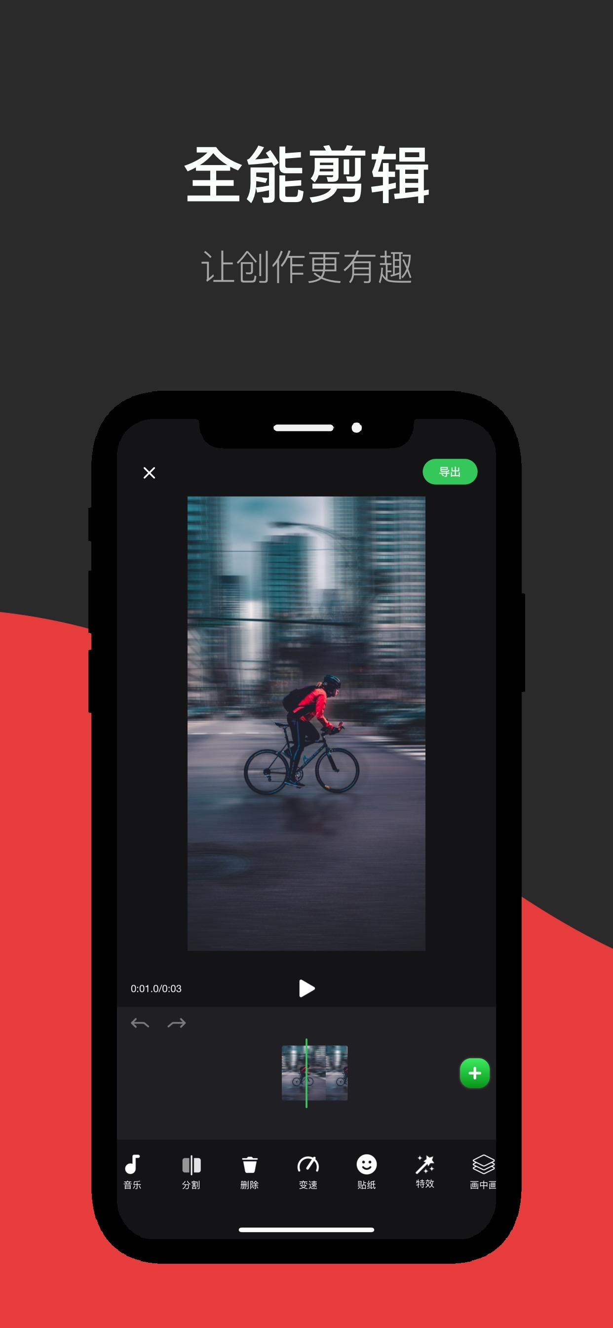 从录制视频到后期编辑,无论是滤镜,音乐,表情,文字还是动态相框,都能以最简洁的编辑操作,制作超乎你想象的潮流视频。 快用视频表达自己,用精彩留住回忆! 【视频编辑】 - 自定义分辨率:高清or标清,合适的尺寸 - 快速修剪:精准裁剪你喜欢的片段 - 超多滤镜:随心选择,定义不同 - 音乐/录音:搭配不同风格的音乐,或录制自己的内心旁白 - MV:特色动态MV,锦上添花 - 文字/贴纸:缤纷贴纸,文字可调色彩,让视频完美,再完美一点 - 倒放/慢放/快放:速度自由控制,更可以拼接、剪切、旋转视频! 【短视频录制】 - 电影质感的视频滤镜,具有震撼的视觉体验 - 庞大的背景音乐库,烘托气氛 - 细腻美颜效果,让你镜头感爆棚 【图片合成视频】 - 选择多张图片,回忆也能动起来 订阅后可以享受的功能: -视频拼接:支持2~4段视频拼接,抖音视频制作利器 -无默认水印:不再显示短视频制作水印图片 -解锁全部滤镜:多种滤镜免费使用不断更新 -纯净无广告:永久告别使用过程中的广告干扰 -高级切割功能:可以给视频增加转场文字 * 我们的标准订阅选项为: 提供VIP连续包周,VIP连续包月,VIP连续包季度,VIP连续包半年,VIP连续包年的订阅选择。订阅期间可永久告别广告打扰;可享受全部滤镜、视频拼接、高级切割功能;无任何功能限制;获得更多功能优先体验权。 * 在您确认购买时和每个续费周期开始时,我们会从您的 iTunes 账户中收取订阅费用。 包含免费试用期的订阅将自动续订为付费订阅。 在免费试用期结束前至少 24 小时,您可以在 iTunes 设置中取消您的订阅或免费试用。 取消订阅将会在当前订阅周期最后一天后生效,一旦取消订阅生效,您的订阅服务权限将失效。 隐私政策:https://docs.google.com/document/d/1CS-r5Czfz7kUPd2ZNHC5-Svp2jKqovRq05KhpG2dWRU/edit?usp=sharing 用户协议:https://docs.google.com/document/d/157c4w0THhKbC4uJnK1m1H3oU6G6x1tZc56iOy7InIvo/edit?usp=sharing