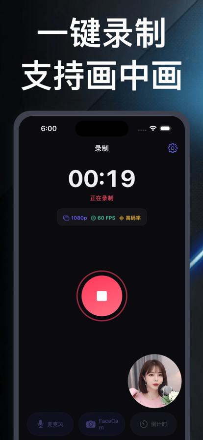 录屏是一款简单好用的录制屏幕App。 帮助您轻松录制高清手机视频、手机游戏、网络课程、主播直播、在线会议等各种场景。 主要功能: 1、画中画:将前置摄像头画面和麦克风音频叠加在视频上,适用于游戏解说、视频讲解等,支持1080P高清导出; 2、语音解说:将手机麦克风添加到原有视频上,可分别设置原视频和麦克风音量大小,适用于讲解视频内容等; 3、视频编辑:包括给视频涂鸦、贴图、添加背景音乐、裁剪、改变比例、添加滤镜、添加文字、拆分、翻转、修改视频参数等; 4、视频转音频:提取视频音频并导出为MP3格式; 5、提词器:录制视频,手机会展示要说的台词,方便录制; 6、自由选择分辨率/帧率/码率,支持1080P清晰度的高清视频; 只要您想录制手机屏幕的内容,就可以使用本App。 保存游戏的精彩瞬间、视频通话、体育赛事、网络课程、主播的精彩时刻、电影的高潮部分,用录屏App就够了!!!