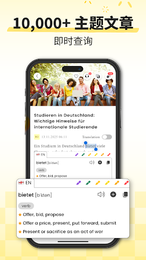 Readle German『每日德语阅读』是独特德语学习软件,最好的自学德语助手。从适合你德语程度 A1-C1 并感兴趣的新闻文章开始阅读,轻松增强德语阅读与听力能力。搭配阅读测验、单词记忆工具,帮助你了解德语语境,高效的背单词。<br> <br>☆轻松阅读德语,高效学习小语种:<br>首先选择你的德语程度,挑选你喜欢的主题,透过持续的阅读与听力练习,搭配语法说明、重点单词、即时德语字典、阅读测验的帮助,让你不知不觉提升德语能力。<br> <br>不论你是 A1, A2的初学者或是 B2, C1 进阶德语学习人士,参加德福、欧标语言检定考试(TestDaF)、歌德检定(Goethe-Zertifikat) 或生活、职场商用德文,吸收知识的同时加强德语听说读写!<br><br>【 量身打造德语内容 】<br> - 文章标示适合阅读程度A1,A2,B1,B2,C1,让你理解及适应语言程度,增强逐渐语感。<br><br> 【 德语真人发音 】<br> - 文章搭配母语外教德语朗读,让你边读边听,增强听力能力。<br><br>【 即时德语词典】<br> - 即点即查的中德词典翻译,让你随时查单词,完整理解内容。<br><br>【 重点文法与单词 】<br> - 重点语法详尽解说、重点单词整理,让你轻松提升阅读能力。<br><br>【 阅读测验 】<br> - 文章学习完成后,透过阅读测验,训练自己的理解能力。<br><br>【 背单词 】<br> - 内置单词卡复习工具(如Anki暗记、年轮)。简单新增文章中阅读到的新单词到你专属的词卡,透过单词卡持续复习,帮助你高效率记忆单词、抗遗忘。<br><br>【 丰富德语内容 】<br> 内建1000种以上内容文章,让你立马开始学习:<br> ・德国文化<br> ・新闻时事<br> ・科技<br> ・旅行<br> ・交通<br> ・运动<br> ・美食<br> ・健康<br> ・娱乐<br> ・科学与医疗<br><br>Readle German 是德国生活、学习必备,同时也是你考试、升学,最好的自学德语助手。 Learn German with Readle together!<br><br>——————<br>重要提醒:<br>我们提供一部分德语 A1 和 A2 级别的文章免费阅读学习,免费文章会不定期更新。为了学习本应用的所有A1, A2内容,以及B1, B2, C1 高级别的德语内容,需要按月或按年订阅高级版本。<br><br>按月订阅和按年订阅到期后将会自动续费,如需取消,请在当前期限结束前最少24小时关闭自动续费。在当前期限结束前的24小时内,将通过Google 帐户向您收费。购买确认后,将在Google中付款。购买后,如需管理订阅和关闭自动续订,请前往 Google 进行“帐户设置”。 <br><br>——————<br>你的鼓励和建议是 Readle 团队不断完善的动力,我们期待你的评分及评论。<br><br> ・反馈问题:support@readle-app.com<br> ・隐私政策:https://readle-app.com/privacy-policy/ <br> ・使用条款:https://readle-app.com/term-of-use/
