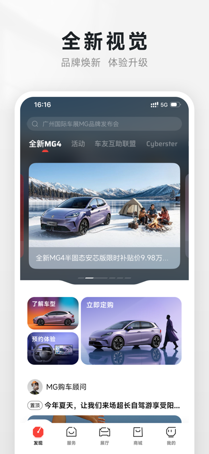 MG品牌SLOGAN “YOUNG FOREVER 智领风尚” ,宣告为每一颗年轻的心打造梦想座驾的承诺! MG Live是上汽名爵MG的官方APP,作为连接百万用户的一站式服务平台,集官方资讯、车友社区、数字展厅、车联车控、精品商城于一体。它不仅是一个APP,更是车友们畅享车生活的品质家园,MG Live APP全新版本正式上线!即刻下载注册,MG车友圈等你相聚! APP功能亮点: 【发现】汇集最新品牌资讯,热销车型专题讯息 【社区】线上线下车友活动,丰富话题活跃交流 【产品】了解最新车型产品,一站式个性化购车 【商城】精选海量好物商品,积分现金混合支付 【我的】查看管理您的订单,解锁多种会员权益 更多详情,访问上汽名爵官网:https://www.saicmg.com