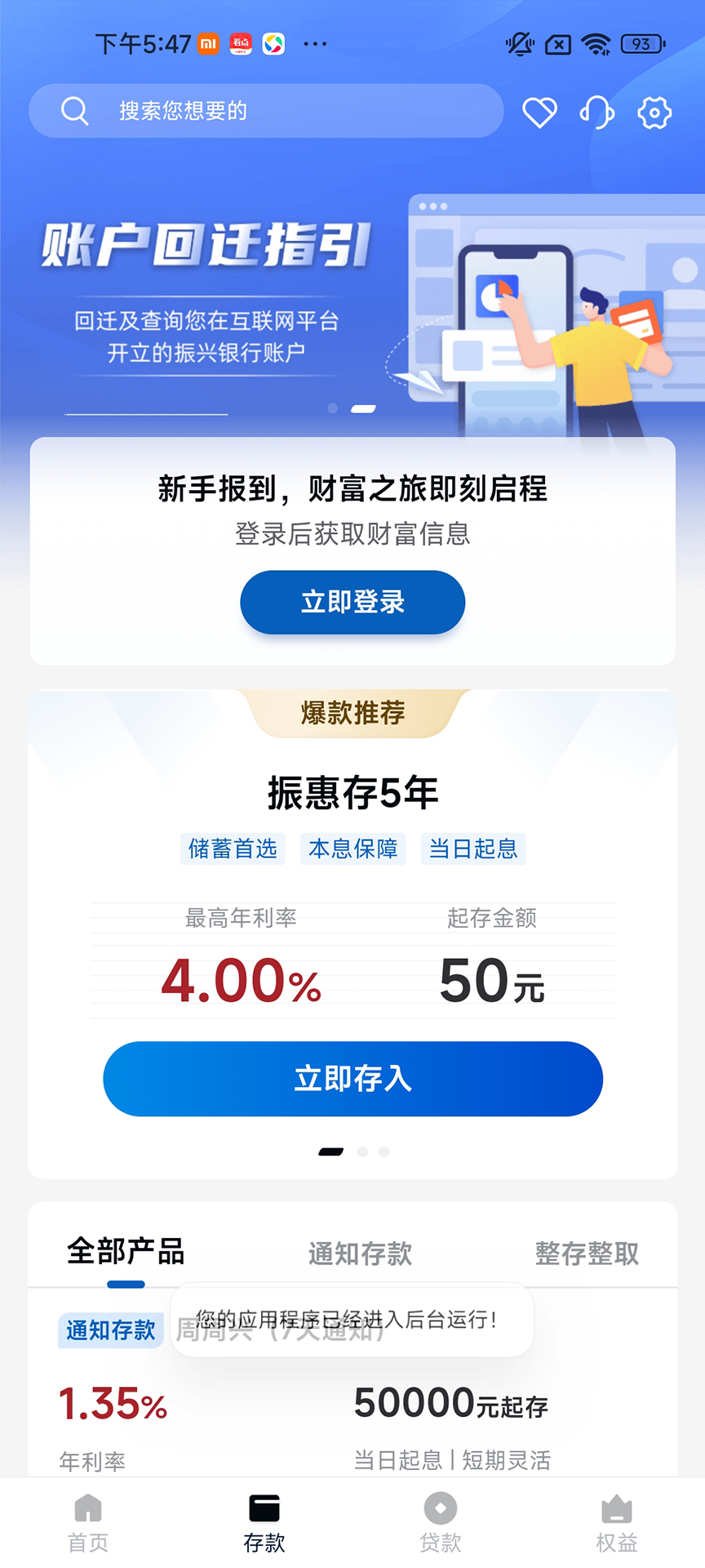 辽宁振兴银行手机银行闪耀登场。秉承振兴银行高效、快捷、灵活 的服务宗旨,为您打造更加专业、简单、安全的移动互联新生活!辽宁振兴银行手机银行并具备以下特性: 一、开户更快速:只需1张银行卡、1张身份证、1分钟,轻松完成注册开户; 二、安全有保障:嵌入生物识别(人脸、指纹)等重验证手段,应用于开户、登陆、交易,通过组合交叉验证方式 ,保障您的资金及账户安全; 三、支付更便捷:支持人行、银联、网联等支付渠道,让您的资金划转更便捷; 四、更省钱:充值、转账、提现等手续费全免,让您更轻松自如。 五、存款更智能:低门槛、高收益、自动靠计息支持灵活支取,实现您的资金回报最大化。 六、专业财务管理:让你的账户资产一目了然,每一笔收支尽在掌握。