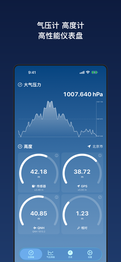 气压计使用了手机里面自带的气压传感器进行测量气压。它是目前最准确的气压测量工具。 功能: 1. 最精确的气压测量工具。 2. 实时获取最新气压信息。 3. 实时获取最新天气信息。 4. 动态图片配合天气变化。