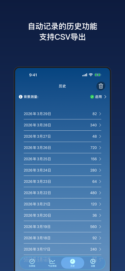 【Torr】是一款集气压与海拔实时测量、10日天气预报、头痛预警信息、历史记录查看及文件导出于一体的免费气压计应用! 为登山爱好者及户外活动人士提供高精度实时测量数据仪表盘功能,确保安心使用。 通过设备内置的气压传感器、运动传感器及GPS采集数据,支持离线使用。 内置实时变化图表,可清晰观察台风来袭、暴雨突发、楼梯电梯升降、坡道行驶等短时气象变化。 高度计支持同时查看传感器、GPS 和 QNH(海面更正气压)三种来源的数据,以及根据登山口等已知海拔进行校准后的数值。 每个高度通过弧形仪表直观显示,点击即可了解各来源的特点与精度。 气压与海拔支持多种单位转换,可满足研究人员及学术机构的专业需求。 针对易受天气变化影响、饱受偏头痛或气象病困扰的用户,本应用提供未来10天气压与天气预报图表,并基于医学依据发布每6小时更新的头痛预警信息。 直观流畅的图形化界面操作体验,助力您每日有效预防与应对。 所有测量到的气压数据将自动存储于应用内。 支持后台测量模式,即使应用处于后台或睡眠状态仍可持续监测。除查看历史数据外,还可导出CSV格式文件。 后台运行时支持实时动态功能,您可在动态岛或锁屏界面查看实时数据。 除主应用外,本应用亦兼容Apple Watch,可即时查看气压与海拔数据。 〜集气压相关当下、未来与过往信息于一身的高性能全能气压计应用〜 这款看似理所当然却独一无二的应用,正是「Torr 托尔」。 【功能一览】 ・仪表盘 ・气压计(基于气压传感器的气压数据) ・高度计 — 以弧形仪表一览显示 4 种来源的高度 ・传感器高度(气压传感器的绝对高度) ・GPS 高度(卫星定位的海拔高度) ・QNH 高度(海面更正气压高度) ・校准高度(根据已知海拔进行的校准) ・气压预报 ・覆盖10天内的周边海平面气压值及天气预报 ・清晰呈现升降趋势的气压曲线图 ・基于医学依据的6小时偏头痛/气象病预警 ・历史记录 ・自动测量数据累积 ・日志导出至CSV文件 ・后台持续测量模式 ・单位设置 — 7种气压单位:Torr、hPa、kPa、mBar、psi、inHg、mmHg ・主题配色方案 ・Torr Pro付费版可屏蔽广告 ・支持Apple Watch ・锁屏小部件 ・实时活动 【其他说明】 部分机型未配备气压传感器或运动传感器。 此类设备可能无法使用仪表盘功能,敬请留意。 使用气压预报需开启定位服务并连接互联网。 后台测量功能需使用定位信息。 如有需求或疑问,请通过评论区或支持页面提交。