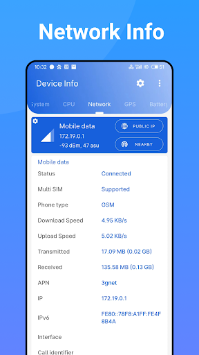 “设备信息”会为你呈现有关手机型号、设备ID、硬件、系统、CPU、GPU、RAM、架构、存储、应用程序、电池、网络、传感器、相机、硬件温度等相关的详细信息。还能够为你监控CPU频率和实时传感器数据 ,测试硬件,对各个功能进行基准测试。<br><br>你还可以从而获取到设备网络的详细信息:包括WiFi、移动网络、公共IP、VPN连接状态和双SIM卡。 此外,它还是你管理文件和分析应用程序的最佳帮手。<br><br>立马就来试试这个如此简单且强大的必备工具吧!能够令你更加轻松地查看手机或平板电脑上的信息,精准且井然有序。<br><br><b>主要功能:</b><br><b>📱硬件信息</b><br>全面了解设备型号、CPU、GPU、内存使用情况、存储容量、蓝牙、电池状态、传感器、显示器和摄像头等。获取CPU的名称、架构、核心、类型、频率、制造和调速器。所有设备信息一应俱全!<br><br><b>ℹ️设备关键标识符</b><br>查看重要的设备信息:设备ID、制造商、品牌、Google服务框架ID和广告ID,检查你的运营商ID、MCC与MNC。<br><br><b>📁存储分析</b><br>快速查找并清理冗余文件、重复文件、大文件和截屏以释放更多存储空间。<br><br><b>🔎应用程序分析</b><br>分析和检查所有应用程序的详细信息,例如目标SDK、最低SDK、安装程序、隐私权限、本地库、签名算法、安装位置等。<br><br><b>📋应用详情</b><br>提供应用程序列表和最详细的信息:应用程序版本、AndroidManifest.xml、活动、服务、证书、权限、内容提供商、广播接收器等。 管理应用程序:分享APK、卸载、在系统设置中查看等。<br><br><b>🛠硬件测试和设备基准测试</b><br>测试设备屏幕、硬件、传感器、手电筒、按钮和指纹解锁。直接查看每个硬件能否正常工作。<br><br><b>🌐网络连接</b><br>显示设备的无线网络和移动蜂窝网络信息、IP地址(IPv4 和 IPv6)、连接信息、公共IP、VPN连接状态、运营商以及双卡信息。<br><br><b>🤖系统信息</b><br>了解安卓系统版本、构建ID、构建时间、安全补丁级别、引导加载程序、基带、root访问权限、时区、正常运行时间、Java运行时间、OpenGL ES、核心、DRM信息等。<br><br><b>🔋电池</b><br>实时监控电池状态:电量、电流、温度、电压、容量、健康状况和技术。<br><br><b>📷相机</b><br>展示最详细的相机规格,包括百万像素、分辨率、焦距、传感器尺寸、快门速度、视野、自动对焦模式、人脸识别模式、相机功能等。<br><br><b>🎛传感器</b><br>查看你设备的所有传感器信息,包括类型、供应商、功率、分辨率、最小延迟、最大范围、报告模式等。 查看加速度计、接近度、陀螺仪、磁场、光线、方向等的实时数据。<br><br><b>📤文件导出</b><br>导出并保存所有应用程序图标、APK、AndroidManifest.xml等相关信息。帮助你可以轻松方便地操作应用程序。<br><br><b>🧩主屏幕小组件</b><br>在主屏幕上生成简易小组件,可以实时显示各种数据。 例如内存使用、电池状态和电压、WiFi或移动数据连接等。<br><br>📱 你可以从“设备信息”中获得什么:<br>★ 设备信息<br>★ 系统信息<br>★ CPU详情<br>★ 存储使用情况(内部&外部&系统)<br>★ 硬件测试<br>★ 设备校准<br>★ 电池健康<br>★ 应用程序信息<br>★ 实时传感器信息<br>★ 网络信息<br>★ 双SIM卡信息<br>★ 相机信息<br>★ 显示规格<br>★ 硬件温度<br>GPS 和卫星信息<br><br>👇权限👇<br>设备信息需要获得完整设备信息和运行测试的权限。 我们向你承诺:不会采集或共享任何个人信息。<br><br>READ_PHONE_STATE - 获取网络信息需要此权限<br>ACCESS_FINE-LOCATION 和 ACCESS_COARSE_LOCATION- 获取位置信息需要此权限<br>CAMERA - 手电筒测试需要此权限<br>BLUETOOTH_CONNECT - 蓝牙测试需要此权限<br>READ_EXTERNAL_STORAGE - 接收器和扬声器测试和存储分析需要此权限<br>WRITE_EXTERNAL_STORAGE - 导出apk需要此权限