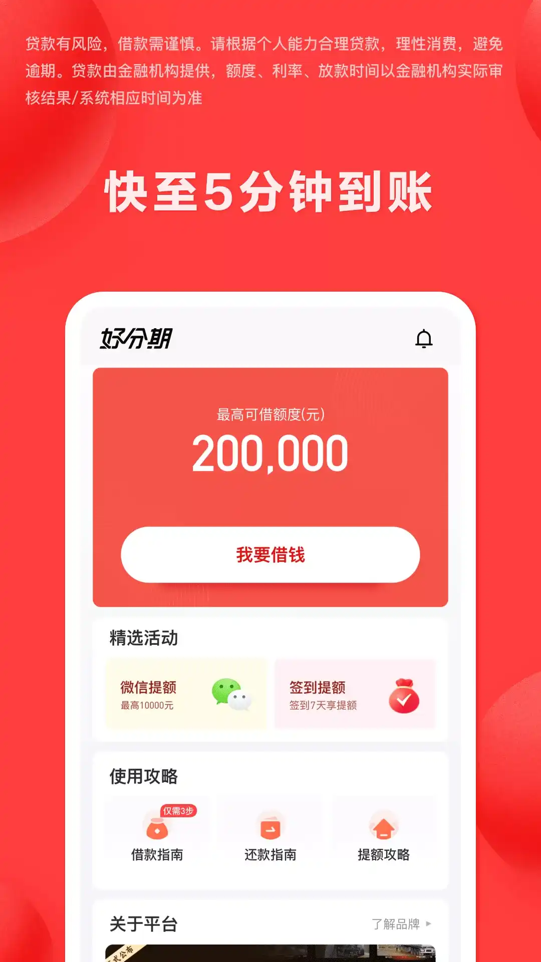 【好分期的优势】 【借款额度高】审批通过后,额度最高可达200000元! 【操作便捷】手机在线申请,线上自动化审批,最快5分钟到账 【借还灵活】支持多种还款方式,最长可分12期慢慢还 【安全借款】正规金融机构,多重隐私保护,让您借贷更安心 【关于好分期】 好分期是一款安全可靠的在线信贷科技服务平台!我们为金融机构和有需求的客户提供全流程科技及辅助服务。好分期提供的合作金融机构信贷产品期限灵活,多至可分12期随心还,用手机即可申请,操作流程简单明了,可以在线清楚查看借款还款进度,减轻你的临时经济压力。快来下载好分期领取你的惊喜额度吧! ——温馨提示—— 贷款有风险,借款需谨慎。贷款具体利率、可借额度及放款时间以金融机构实际审批为准,请根据个人能力审慎借贷,避免逾期。 ——联系我们—— 官网: www.haofenqi.cn 客服电话:400 085 6608(服务时间9:00-18:00)