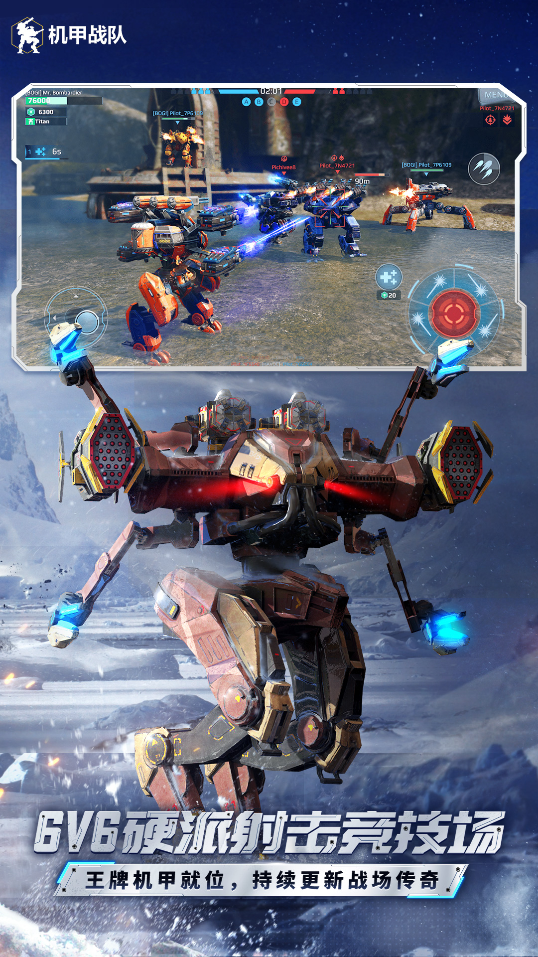 机甲战队是一款6v6多人联机射击对战手游。玩家作为指挥官,通过控制机器人夺取灯塔、摧毁敌方机器人来扩张领土,在对战中获胜。游戏中含有多达70种不同移速和生命值的机器人,以及海量武器可供玩家自由选择搭配,高自由度打造对战武器。为应对奇袭、错综复杂的战术机动和敌人的诡计做好准备。毁灭!占领!升级!变强——证明自己是机甲宇宙中最优秀的机甲指挥官! 游戏特色: - 72个各有所长的战斗机器人 - 12个巨大的泰坦与机器人并肩作战 - 超过121种武器,包括弹道导弹、能量武器和等离子体武器 - 25个模块内置机器人装置,可以提升战斗性能并打造你的独特战斗风格 - 80位传奇机师真正的王牌,擅长驾驭机器人并为其赋予独特的技能 - 22种无人机一种小型支援单位,可以给予机器人一系列被动加成 - 7种轨道支援太空母舰,可以支援战斗并且有能力扭转战局 - 11座炮塔可装备在轨道支援飞船上的功能部件,共有三种类型:治疗型、护盾型和输出伤害型 - 诸多机器人与武器的组合。创造一台适合自己游戏风格的战争机器 - 创建自己的派系,带领其走向胜利 - 加入PvP 对战,挑战来自世界各地的对手 - 尝试“灭绝”模式。这是一种每周举行一次的PVE模式,具有独特的蜘蛛敌人、终极头目、不同玩法变化,以及为最出色玩家准备的丰厚奖品