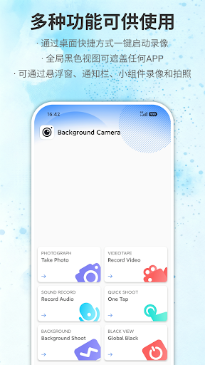 后台相机是一款高质量的后台拍摄应用程序,可让您在没有预览的情况下拍照和录製视频。无论你是在玩游戏、看直播、听音乐、聊天、使用其他应用程序,甚至是锁屏。您可以随时拍摄高质量的照片、视频和音频。支持前后两个摄像头同时录制视频,且录制期间可动态切换摄像头。<br><br>有没有安装和使用过秘密摄像头APP、后台录像机或摄像机APP、静音摄像头APP、隐藏APP?现在只有后台相机APP就足够了。<br><br><b>功能特点</b><br>★ <b>隐私至上</b>:对他人隐藏照片和视频。<br>★ <b>强大安全</b>:支持 PIN 锁和隐藏应用功能。使用密码锁保护您的文件夹内容。<br>★ <b>快速访问</b>:在手机主屏幕创建快捷方式,或在通知栏添加快速设置磁贴,一键即可立即开始录制。<br>★ <b>可定制水印</b>:具备时间设置或自定义水印文本功能。录制时可添加水印,如时间文本或其他自定义文字。<br>★ <b>隐蔽外观</b>:将桌面应用图标替换为其他常见应用,如指南针或计算器应用。<br>★ <b>模拟息屏</b>:在任何其他应用(如直播应用或视频聊天)上覆盖全局黑色视图,模拟手机屏幕关闭状态。“强制全屏” 功能需要无障碍权限。<br>★ <b>锁屏拍摄</b>:通过点击通知栏中的通知组件,在锁屏状态下拍摄照片和录制视频。<br>★ <b>桌面小部件支持</b>:支持桌面小部件,并且可以自定义小部件按钮样式。<br>★ <b>黑屏操作</b>:在黑屏模式下,可通过 “音量” 键或蓝牙控制器开始 / 停止录制视频、拍摄照片和录制音频,就像手机已关机一样。<br>★ <b>双摄像头支持</b>:支持前置和后置摄像头,支持并发录像(前后摄像头同时录制)。<br>★ <b>自动分割视频文件</b>:自动分割视频文件,便于管理。<br>★ <b>灵活存储</b>:可保存到可移动 SD 卡,或您选择的相册。<br>★ <b>无限制录制时长</b>:享受无限制的视频录制时长。<br>★ <b>并发录像</b>:前后双摄并发同时录像,录像期间可以任意切换摄像头。<br><br><b>由于系统限制,手机在长时间不亮屏时会进入省电模式,关闭摄像头等高耗电硬件,导致录像异常。因此,在录製视频且无需使用手机时,我们建议您使用黑屏模式,而不是按电源键。</b><br><br>大多数功能都是免费的。订阅版本包括:<br>1.没有广告。<br>2.超级黑屏功能,可以覆盖任何其他应用程序模拟屏幕关闭状态的黑色视图。<br>3.一键快速拍摄,快速启动拍照。<br>4.在使用其他应用程序或玩游戏或看youtube时在后台拍摄,拍照和录製视频。<br>5.使用手势密码保护您的文件和应用程序。<br>6.隐藏媒体文件。它们只能在我们的应用程序中查看,并且不能被任何其他应用程序检测到。<br>7.图标替换:选择你喜欢的应用图标。<br>8.在照片和视频上添加时间水印和自定义水印。<br><br>订阅以解锁以上所有功能。非常感谢您的支持。当然,您也可以通过观看打赏广告来解锁。<br><br><b>重要提示2:<br>1. 录製时不要在其他应用上打开相机。<br>2. 录像过程中请勿手动点击电源键锁屏。<br>3. 请使用黑屏模式模拟屏幕关闭状态。<br>4. 由于通知栏和导航栏是系统组件,因此需要无障碍服务(Accessibility Permissions)来隐藏它们。 我们不会通过该服务获取用户敏感数据。</b><br><br>应用官网:https://www.hzweixi.cn<br><br>如果你喜欢这个APP,请给它5星★★★★★。我们将非常感激。您可以通过电子邮件与我联系以获取反馈或帮助。