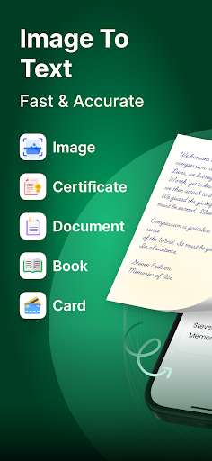 您需要便携式图像到文本转换器吗?现在,Cam Scanner 可以帮助您将手机变成智能扫描仪,以便在各种情况下,尤其是工作和学习,从照片或文档(收据、笔记、发票、白板讨论、名片、证书等)中以有组织的布局拖出文字。<br><br>Cam Scanner 是一款非常适合将打印文档自动转换为可编辑文本的工具,适用于所有 Android 手机。它在扫描和数字化书籍、杂志或照片中的文字方面非常出色。您会惊讶于该应用程序的速度和准确度!凭借尖端的 AI OCR(光学字符识别)技术,Cam Scanner 以极高的准确性从不同语言的图像中识别字符。<br><br>拍照或从相册上传图像进行扫描时,您可以裁剪某些部分以突出显示您需要转换到文本中的文字。我们还提供高级图像编辑工具,包括智能裁剪、旋转、排序、滤镜等。<br><br>Cam Scanner 对于商业和学习都是相当高效的生产工具,它支持将多个图像扫描到一个文件中,这使得在学校课程或商务会议中做笔记变得更快速有效。它是快速记录写在黑板或幻灯片上的备忘录的最佳应用,能将您从麻烦的逐字记录中解放出来。<br><br>特色优势<br>- 高准确率<br>- 快速扫描<br>- 支持多达 50 种语言<br>- 适用手写,包括草书<br>- 以PDF/text/JPG等格式保存在本地或分享到其他应用程序<br><br>请注意,模糊的图像会导致准确性降低,因此请尽量确保原始文件尽可能清晰。
