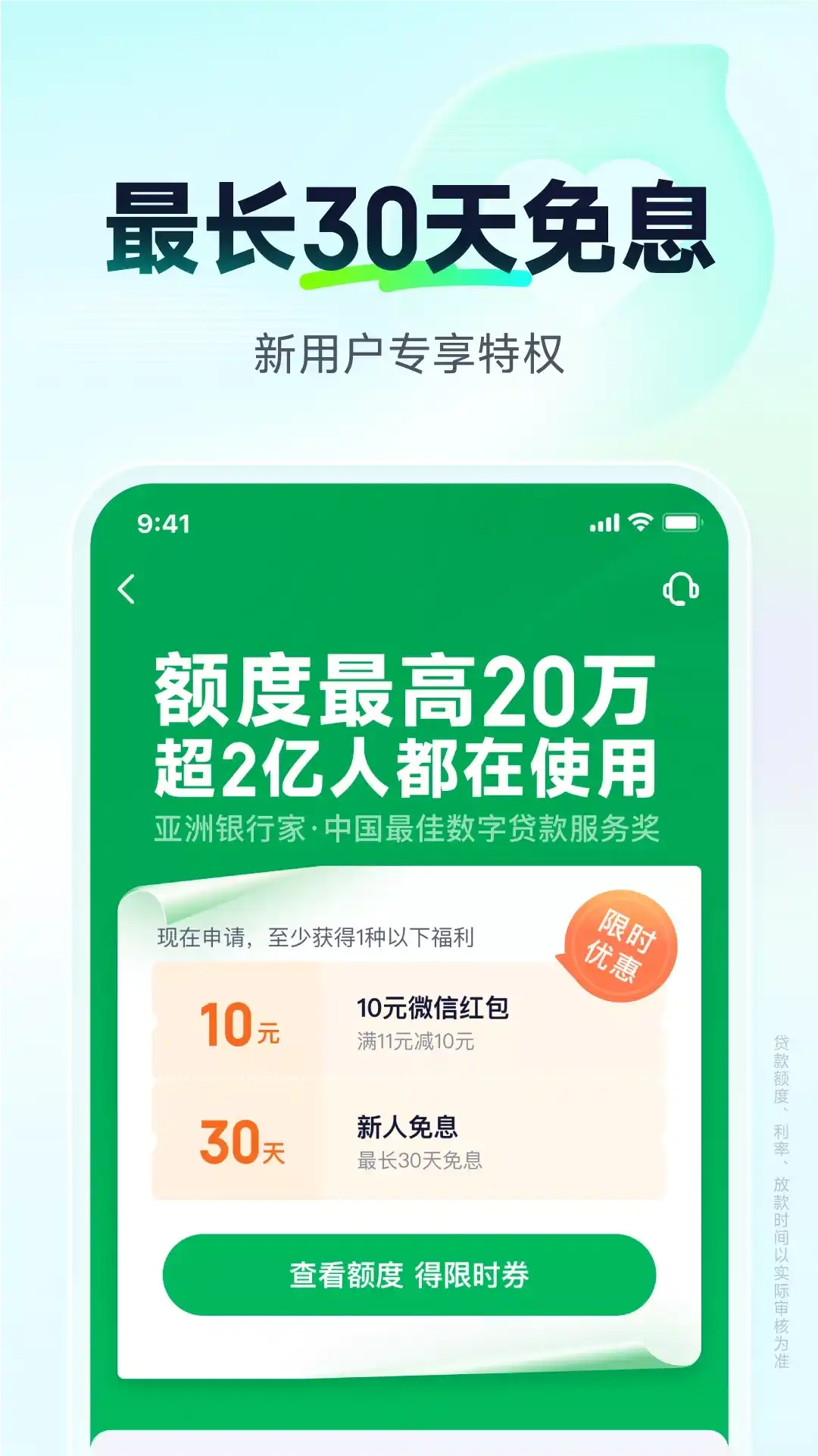 奇富借条(原360借条),是奇富科技旗下信贷科技服务品牌,超2.5亿用户选择的持牌机构。 【产品特点】 1、手机贷款额度: 审批后最高额度20万元; 2、偿还贷款息费透明: 借1千元分12期,日息费1毛2起,年化利率(单利)7.2%起(以审核为准); 3、还款方式灵活: 可根据实际需要灵活选择不同的还款方式(可分3期,6期,12期,最长24期仅优质用户可享); 4、手机贷款更便捷: 贷款全程线上申请,免抵押贷款;使用手机号+身份信息等材料即可申请;奇富借条创新“刷脸”识别,免上门,免纸质材料; 5、新人免息礼包规则: 活动开始日期2022年1月1日结束日期2026年12月31日 参与对象:仅针对奇富借条新用户 优惠详情:最高免息65元,借12期享最后一期免息 注:具体券使用规则获取,请以app具体活动页面规则为准 PS: 1.贷款额度、利率,放款时间以实际审核为准; 2.优惠活动仅免除部分利息,详细免息方式以APP内活动规则为准; 3.贷款有风险,借款需谨慎;请根据个人能力合理贷款,理性消费,避免逾期; 4.投资有风险,选择需谨慎。