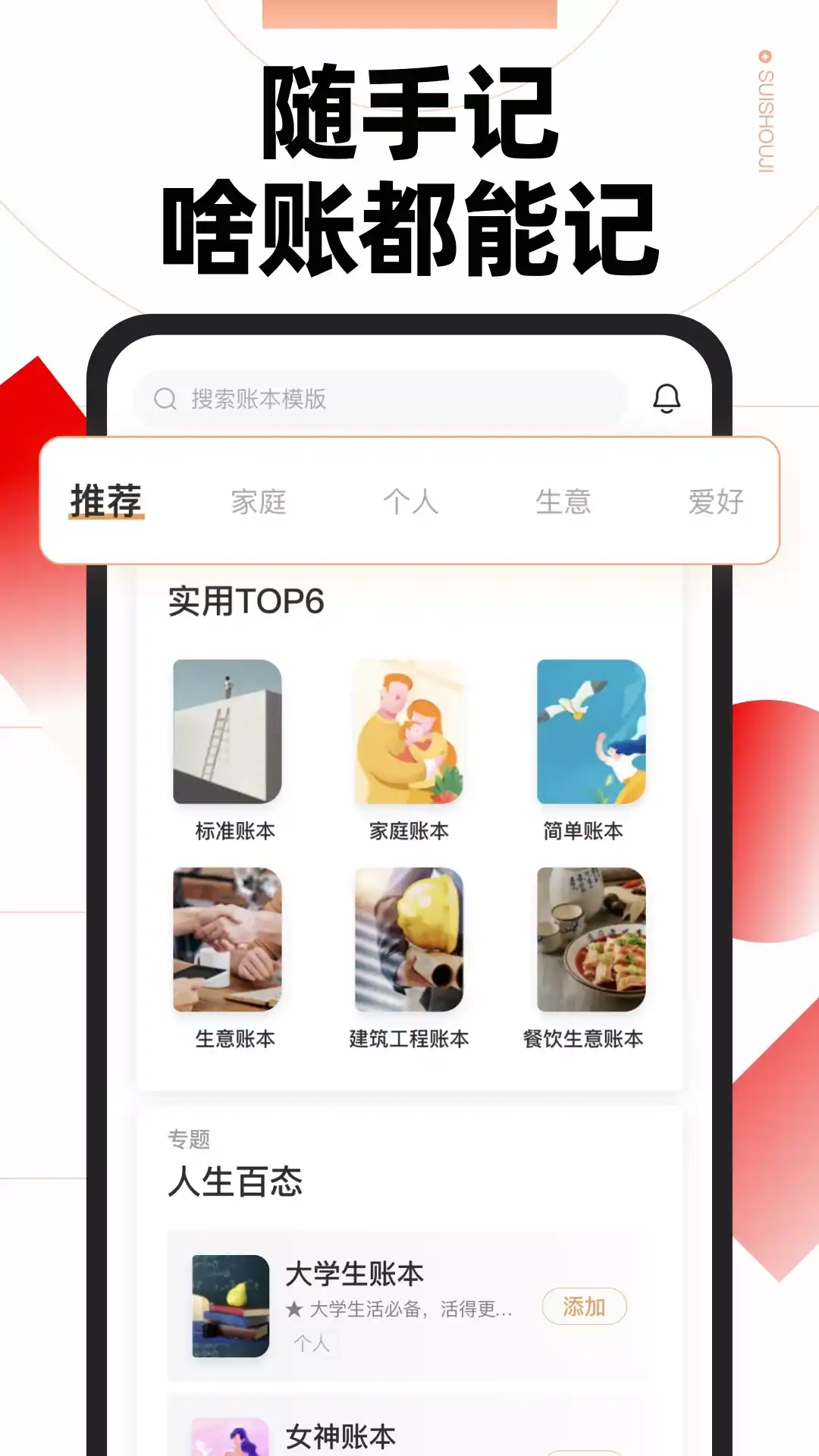 多赚会花每一天,记账就要随手记!海量账本模板,个人、家庭、生意账随心选。 记账快捷又专业,轻松管理多人记账。多维度账单解读,全面了解你的财务状况。账单数据实时存,云端数据不丢失。 【海量账本模板,陪伴你的各个人生阶段】 to成长中的你: - 高中生、大学生账本:生活费聪明花,课外兼职也能记 - 班费账本:班委管钱大家看,班费收支更透明 to工作中的你: - 差旅报销流水账:设定预算不超支,流水详尽不漏报 - 网约司机、健身教练、装修队长:职业账本专属定制 to爱生活的你: - 合租、恋爱、生活账:日常生活随心记 - 旅游、宠物、爱好账:为自己所爱的事物,记录美好回忆 - 攒钱、健身、目标账:设定一个小目标,让账本陪你变成想要的样子 to创业中的你: - 奶茶、快餐、餐饮业:店铺经营实用工具,员工记账权限可控 - 服装、代购、零售业:成本营收全把控,赊销应付不遗漏 - 培训、酒店、服务业:各行各业全覆盖,首页报表指导经营 to顾家的你: - 人情账本、结婚账本:人情红包收入支出一览无余 - 儿童教育、宝宝账本:家人共享宝贝成长点滴 - 汽车、储蓄家庭账本:日常生活分类全,全家合记一本账
