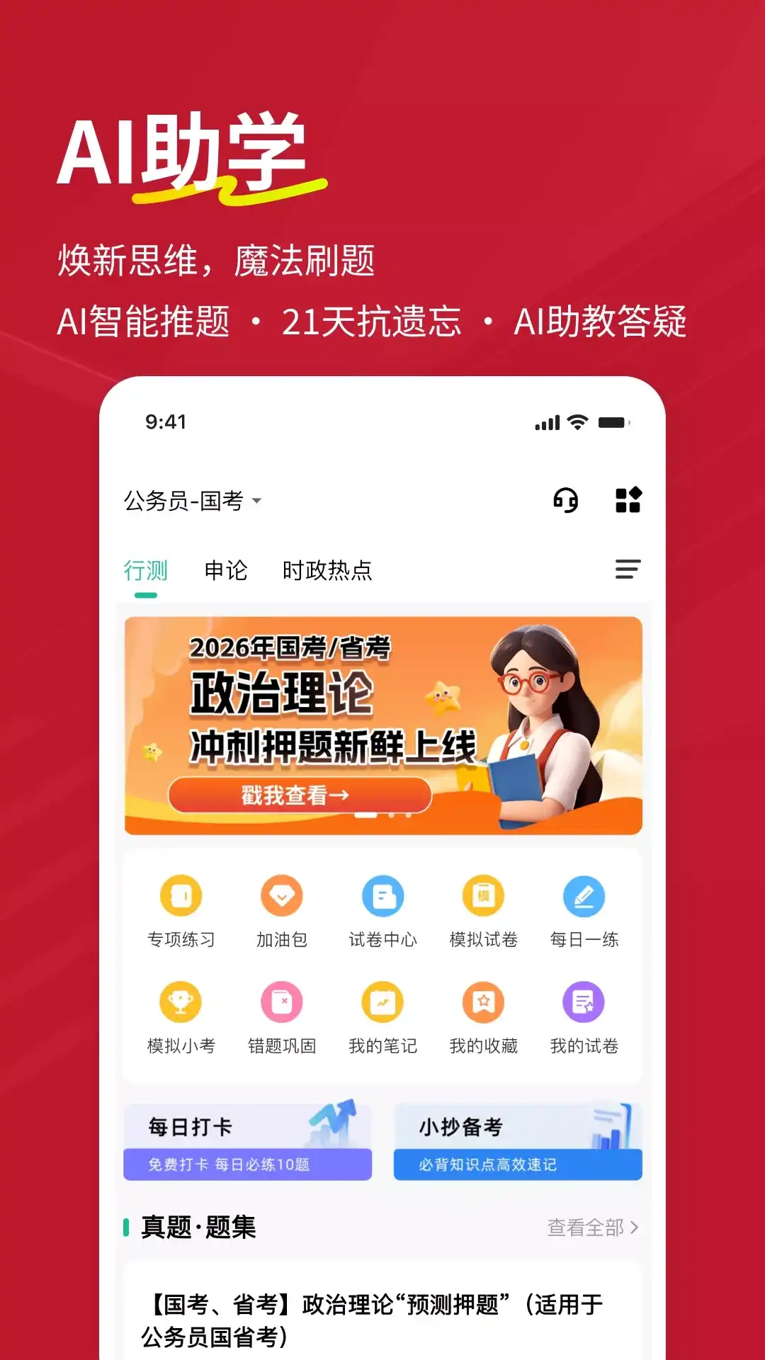 公考练题狗在手,您公务员考试路上的得力助手。 高端班助学 + 海量题库 + AI助教,三位一体备战公考! AI助学焕新上线,章节刷题严格依据公务员考试大纲,AI智能推题精准定位薄弱环节,结合艾宾浩斯遗忘曲线研发“21天公考抗遗忘训练”,让知识在脑海扎根! 公考练题狗,专为备考国家公务员考试(国考)、地方公务员考试(省考)的考生量身打造,覆盖行测、申论全科目,汇集了众多经典题型,以及题目详细解析,提供章节练习、历年真题、模拟测验、高频错题等核心功能,结合AI智能刷题、AI解析拓展、错题巩固、模拟考试等多维模块,助你查漏补缺,全面提升应试能力! >>题库功能: 【时政题目】每月时政、重要会议、政策文件整理的题目实时更新,紧跟考试热点 【章节练习】行测、申论模块知识点细化、分项突破,同步考试大纲 【历年真题】收录近几年国考、省考真题,配备详细解析,与公考亲密接触 【高频题目】大数据分析高频考点与易错题,精准推送高频易错、平台错题巩固练习 【错题巩固】自动生成专属错题本,支持题目反复练习,攻克薄弱环节 【模拟考试】定期举行模拟考试,智能组卷、计时评分,提前适应考试节奏 【小抄备考】浓缩重要知识点,助力考前速记,备考冲刺 【AI智能推题】基于学习情况,个性化推送薄弱知识点+顽固错题+抗遗忘特训题 【AI解析拓展】每个题目均有AI智能解析与思路拓展,深度掌握知识点 >>课程与服务: ·高端班护航:系统精讲+秒题技巧课+班主任督学,全程陪伴备考 >>指南与支持: ·备考资讯、招考通知、复习技巧一站式获取 ·随时学习、多端同步,碎片化时间高效利用 技术支持:鼎维云课堂 联系我们: 微博:@练题狗 微信:liantigouapp 客服电话:+8618290463382(工作日9:00-18:00)