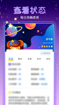 --星座特征:分析十二星座的性格、喜好、追求、绝配星座and死党星座。十二星座最爱谁、最适合跟谁做朋友,让每日星座运势来告诉你答案~ --不得了啦,每日星座运势app里还有明星运势、明星星盘!李宇春、陈伟霆、吴亦凡、杨洋,爱豆的每日运势、星盘信息都在app里~ --星座运势:全面解析你的每日星座运势,帮你了解12星座的每日、每周、每月的运势变化,让你更加了解自己的爱情、健康、事业,随时掌握自己的运势并能时刻做好准备,从容地面对人生。每日星座运势包括桃花运、贵人运、出行运、情绪、事业运、牌运、健康、父母运、子女运等。 --星盘信息:根据出生日期、出生位置测算出你的星盘,帮你解读星盘的奥秘。 【行星信息】解读你的主要性格特征、情绪、情商、审美能力、行为方式、智慧和成就、思考方式、创造力等。 【宫位信息】解读你的上升星座、天顶星座等,包括你的个性、财运、欲望、家庭生活、冒险精神、健康、社交、精神生活、梦想等。 【相位信息】解读你的性情、生活态度、人际关系、想象力等。