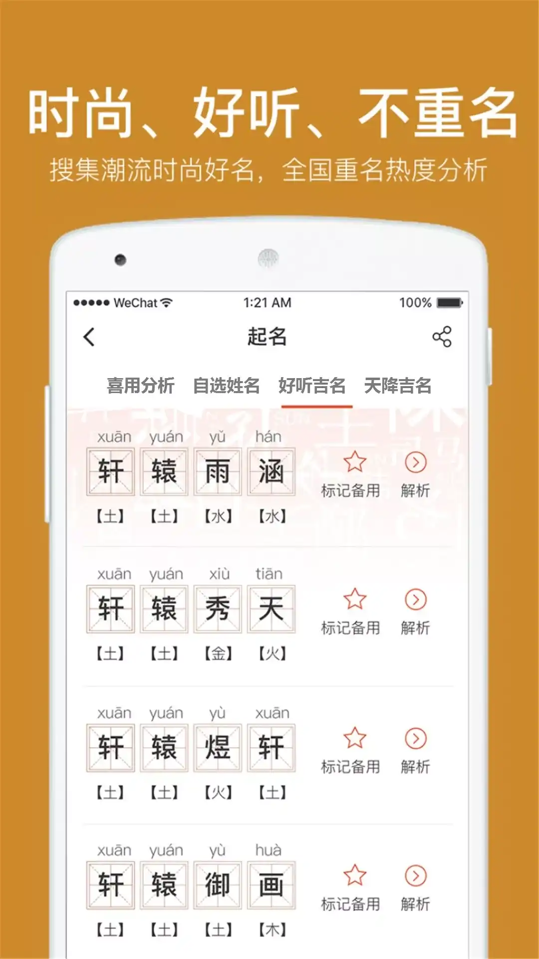 【起名大全 – 嘉铭宝宝起名取名软件】 嘉铭宝宝起名软件是在萃取了传统文化精髓的出生时辰,象数分析,姓名笔画的基础上结合音律音调、字形结构、诗词古文、生肖星座,根据姓名汉字大数据,经过现代科学分析,综合时代时尚程度,独特程度,文化深度,流行趋势等因素,为您量身打造具有意韵深远的助运好名字。 上市至今,已经获得多数用户的五星好评,是优选推荐的起名、取名、名字分析、改名、重名查询APP。 起名取名大全软件不仅深刻剖析了传统的出生时辰,象数,姓名笔画,还结合汉字美以及音律音调字形结构,古文诗词曲赋的文采,严谨的算法和专业国学名师的深厚知识沉淀,是各位宝爸和宝妈起名推荐软件。 【嘉铭宝宝起名取名大全 – 起名模式】 传统文化模式:综合起名,出生时辰起名,象数起名,姓名笔画起名,并结合诗词古文让您轻松起好名,名字超凡! 超好名模式:根据成语典故,唐诗宋词,精选寓意佳,重名少的超好听名字。 吉祥起名模式:汉字字形分析、音律音调分析、传统说文解字、起名智能匹配技术,姓名优雅好听大气从此告别多音拗口、笔画太多! 诗词起名模式:优选古文起名大数据分析 – 诗词起名、论语取名、诗经起名、楚辞取名样样精