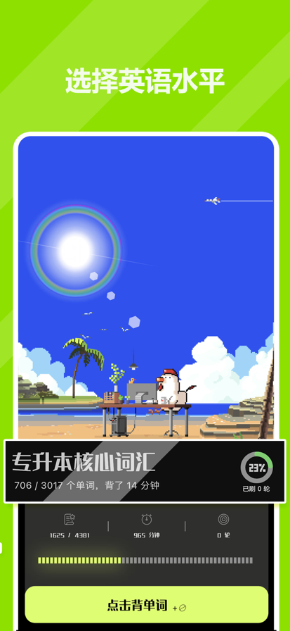 豌豆背单词,是一款可以有效对抗遗忘的背单词软件。 它根据「艾宾浩斯遗忘曲线」打造、并配合中国人背单词的学习习惯;让你不仅单词背得快记得牢,还专注到根本停不下来! ◆艾宾浩斯记忆法 人的遗忘速度随时间的流逝而先快后慢,在记忆的最初阶段遗忘的速度很快,后来就逐渐减慢了,到了相当长的时候后,几乎就不再遗忘,因此及时复习对于记忆单词是非常重要的,这就是艾宾浩斯记忆法的原理。 豌豆背单词,按照艾宾浩斯记忆规律打造「动态记忆算法」,让每个单词在到达遗忘临界点的时候,恰到好处地复习! 经过多次调整抗遗忘策略中的系数以及长期的实验验证,能够根据你的学习情况,为你精准的生成单词学习计划,从而让每日复习量比普通软件少35%,记忆效果却提高50%。 ◆精选词库/自定义生词本 精选英语词表,包括高考、四级、六级、考研、雅思、托福、GRE… 还可以自定义生词本,自由添加管理,打造专属你的单词书。 ◆自定义提醒、打卡分享系统 可开启系统智能提醒,让系统来监督你背单词;完成单词任务可完成打卡分享,感受满满的成就感。严格按照正常的学习步骤,并根据艾宾浩斯遗忘规律严格安排复习;选择目标-设立计划-执行任务-复习任务,各个环节都支持高度自定义。