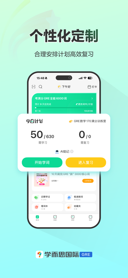 「GRE3000词」是学而思旗下GRE领域权威资深培训机构、美国教育考试中心ETS(GRE出题机构)官方合作和研发伙伴,针对GRE考试专门研发的一款GRE背单词利器。我们为大家精心筛选、收录了GRE考场最新最全必背单词,并且引入艾宾浩斯记忆曲线,根据背词情况帮学生智能建立每日复习任务,再也不怕记不住单词了。 01 科学规划,引入“艾宾浩斯记忆曲线”背单词 为了提高大家的背单词效果,摆脱背了忘、忘了背的烦恼,我们引入了艾宾浩斯记忆曲线,根据每位用户背单词的具体情况,自动生成每日单词复习任务,在你马上要遗忘的时候(5分钟,30分钟,12小时,1天,2天,4天,7天,15天),安排适时的复习任务,这样就再也不用担心记不住啦。 02 最全最新,考场跟生词彻底说拜拜 依托过往十年以来TOEFL、GRE考场填空、阅读、数学最全最新真题,我们精心编选GRE备考词条,汇编出了以下四本词书——《考满分GRE核心3000词》、《考满分GRE急救1400词》、《考满分GRE全能6000词》、《考满分GRE数学术语300词》。不同版本的词书,可以满足不同基础、不同备考时间考生的丰富备单词需求。 03 去伪存真,单词关联对应的GRE真题原文 为了帮助考生减轻背单词负担,避免浪费大把时间记忆一些GRE并不考查的“假”词,我们在传统的单词例句之外,额外将单词和历年GRE填空&阅读真题进行了关联匹配,有助于同学们在背诵单词的同时,真实了解该词汇在GRE考试真题中的考查方式。 04 删繁就简,只背最有效的单词与释义 为了减轻考生的背诵负担,我们优先展示了每个单词在GRE考试中①常考的释义,②熟词僻义,③一词多义。但是,针对一些单词可能存在的,但是并非GRE考查范围的释义,我们选择取消展示,避免为考生阐释不必要的背诵压力。 05 灵活多样,适合自己的才是最好的 为了满足不同考生不同阶段的不同需求,我们提供了三种复习单词模式——①选择Flashcards卡片法,你可以“一张卡片复习一个单词”,兼顾了效率和准确度。②选择做题巩固法,你可以选择据词选中义/据义选词/混合做题任一模式做题巩固单词。③选择极速刷词法,系统会带你快速刷词,在背单词后期非常高效率地帮你检查自己的记忆情况。 如果你在使用过程中遇到任何问题,欢迎与我们联系。每一条反馈都能帮助我们做得更好 :) 学而思出品,必属精品 你永远可以相信学而思,学GRE也是