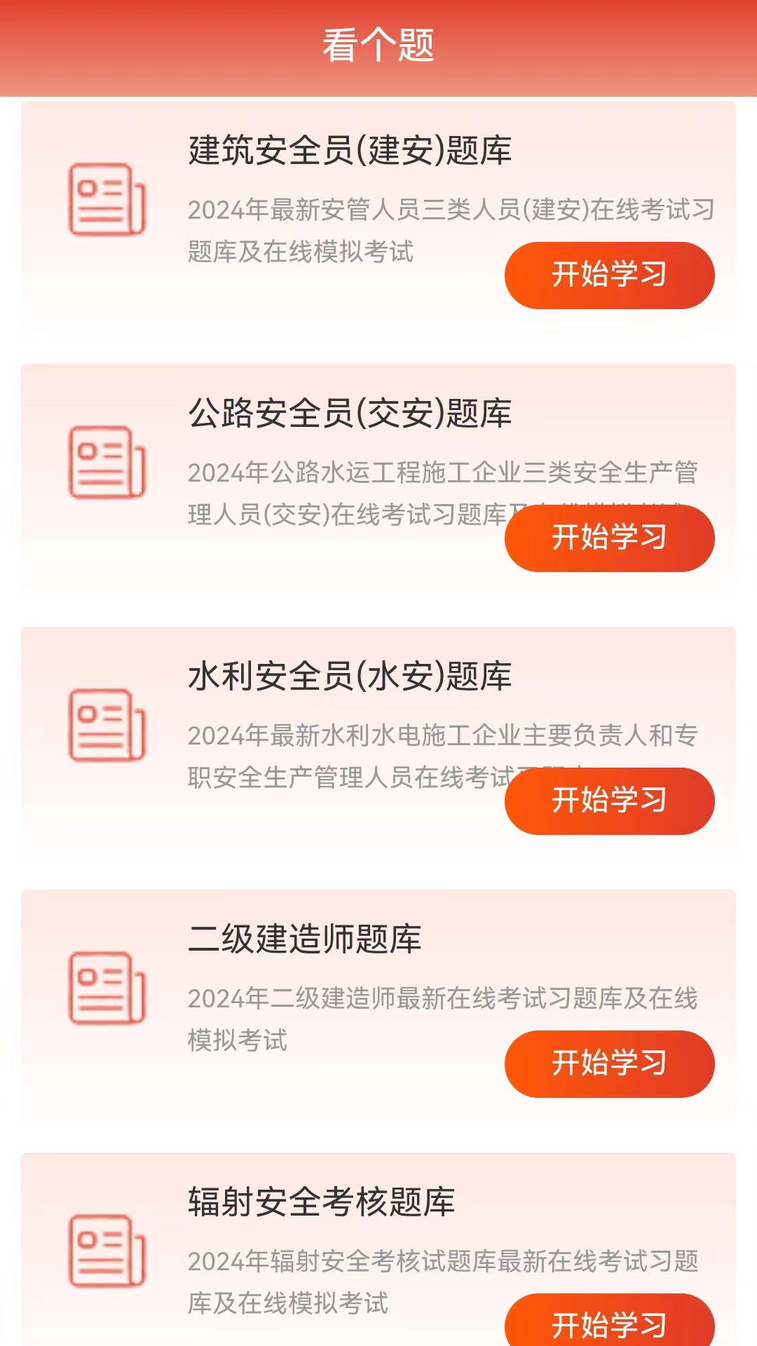 看个题app提供各行业各类大小考试的备考学习平台,平台上有顺序答题、刷题模式、模拟考试等多种方式的在线刷题学习功能,并且在做题过程中自动统计错题及提供自定收藏疑难题的功能,可以让你更轻松的通过刷题学习的方式类备考学习。 考试刷题,就上看个题APP,各个行业的考试习题库在线刷题学习及模拟考试平台!