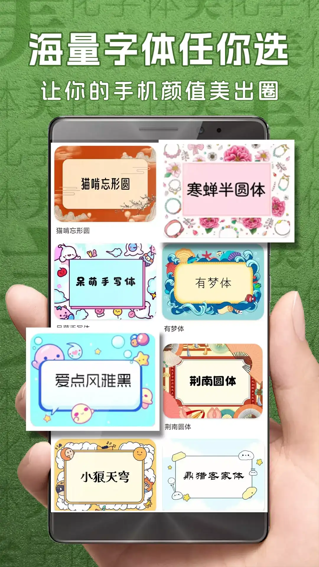 【字体美化大师】8000+免费字体+签名设计+小说阅读,你的个性化手机中心! 不止换字体! 海量免费字体一键更换 × 专享定制签名设计 × 专属小说阅读器。从字体美化到社交个性,再到沉浸阅读,全方位打造你的独特手机体验! 我们提供海量、免费、酷炫的手机字体库,你可以根据个人喜好随意选择和搭配,轻松打造个性十足的手机界面,创作属于自己的主题、壁纸、头像,用酷炫字体书写你的社交名片! 为什么千万用户选择我们? 【海量字体库 & 贴心分类】 内含8000+款免费字体,持续更新!涵盖楷体、黑体、行楷、圆体、篆体等经典字体,以及爆款的明星同款、可爱少女、霸气男生、创意艺术字体。 贴心分类设计,支持按风格、用途、类型筛选,助你3秒找到心仪字体! 【一键更换 & 广泛兼容】 完美支持微信、QQ、微博、剪映、头条等主流APP及各类输入法,聊天阅读更有趣。 【个性定制 & 创意玩法】 不止换字体!更可定制专属主题、壁纸、头像,用酷炫字体书写你的社交名片,成为朋友圈炫酷的你! 【定制签名 & 小说阅读】 重磅新功能! 我们联合专业签名艺术家,为您提供专属艺术签名设计服务,用于合同、社交账号、笔记签名,彰显品味与气场,让你在职场和社交中脱颖而出! 内置专属阅读器,可直接导入本地小说,任意应用您下载的字体和设置背景,打造舒适护眼的阅读界面,享受沉浸式阅读乐趣。 用过的伙伴都说好: “换字体太方便了,微信QQ微博都可以换,而且还是免费的,我身边的朋友都推荐了。” “一直在用的,字体超多,而且找起来也很方便。现在也可以在上面用字体做头像壁纸了,用起来是真香。简直是装机必备啊!” “朋友推荐来的,说里面字体特别好看,更换后的主题也很酷,再也不用上头条百度搜字体了。”