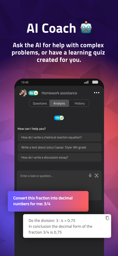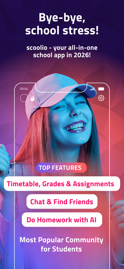 Experience scoolio! Get the ultimate upgrade for your school life! With scoolio, you can manage your schedule intuitively, track your grades and deadlines, and have your GPA calculated automatically. Connect with other students, make new friends, and check out exciting profiles right in your area. Our smart AI Homework Helper provides lightning-fast solutions—just snap a photo of your assignments and let the AI handle the rest. Join the massive scoolio community and make your school days smarter—whether you're in Germany, Austria, Switzerland, or anywhere worldwide! Award: Named "Best App" in Europe at the "Huawei HMS App Innovation Contest" scoolio is constantly growing and currently supports German, English, Spanish, and many other languages. Join in and connect with the global community! WHY SCOOLIO? Your AI-Powered Homework Coach! ▶ Get instant, precise answers to all your questions! ▶ Scan your homework via photo and have it solved directly by the AI. ▶ AI Tutor: Your personal tutoring expert is available for you 24/7. Perfect Time Management! ▶ Your schedule is always ready to go. Never miss an assignment or exam again! ▶ Stay on top of things: Enter your grades and let the app calculate your current GPA. Meet New People! ▶ Chat with like-minded students about the topics that really matter to you. ▶ Discover new friends with the same interests or from right in your neighborhood. Plan Your Future! ▶ Find matching apprenticeships, internships, or degree programs and use the Career Chat for your questions. ▶ Check out exciting job videos and find the next career fairs in your region. Collect Rewards! ▶ Stay active and unlock exclusive badges for your milestones. ▶ Earn gems to get cool extras for the chat or AI features. Features in Detail AI HOMEWORK HELPER • Whether it's a complex school assignment or a creative project—the AI supports you. • Just take a photo, type, or dictate: The AI provides the solution! • AI Tutor: Create customized flashcards for effective and structured learning. SCHEDULE (PLANNER) • Flexibly adjustable class and break times • Create your own subjects including info on classrooms and teachers • Support for A/B/C weeks and individual color coding HOMEWORK & DEADLINES • Track assignments and get timely reminders for important dates • Add photos directly to your homework entries • Sync all your appointments conveniently with your calendar GRADE TRACKER • Automatic calculation per subject and overall GPA • Supports 10 different grading systems • Individual weighting for different types of grades COMMUNITY & NETWORKING • Join chat groups that match your interests or your region • Start private chats and find new besties • Send likes or digital gifts CAREER CHECK • Discover career fields and job postings via video content • Filter offers based on your personal strengths and save favorites • Get in direct contact with companies and get your questions answered easily QUESTIONS OR IDEAS? scoolio gets better with your feedback! Just write to us at support@scoolio.de. Terms of Use: https://scoolioapp.com/terms-of-use
