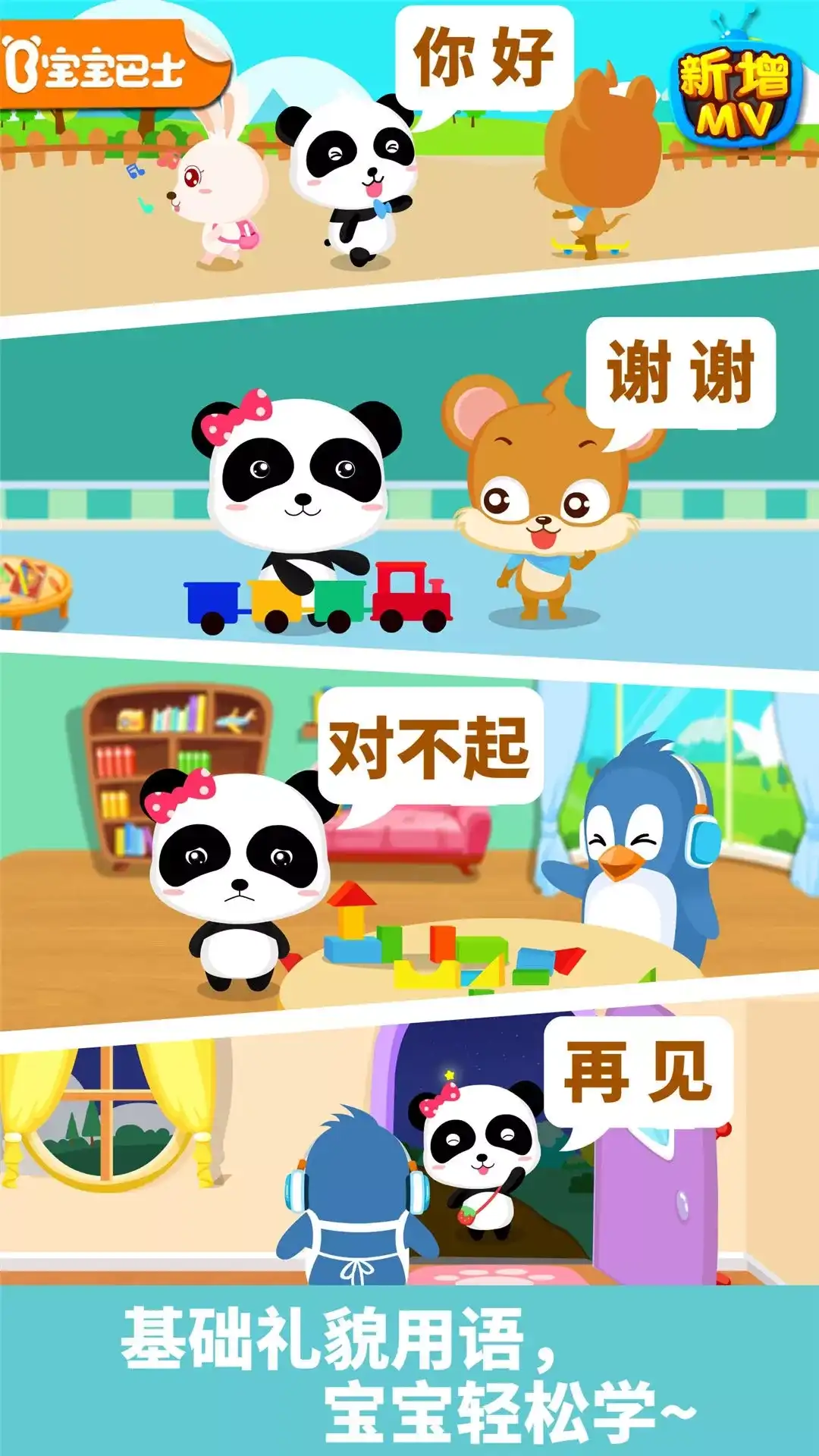 【新增快乐儿歌,郎朗上口记心头!】宝宝在陌生人面前不敢说话? 宝宝收到了礼物不会道谢? 宝宝遇到朋友不会问好? 快来试试《宝宝懂礼貌》吧!教宝宝轻松学会懂礼貌,爸爸妈妈没烦恼~ 【宝宝懂礼貌】更新啦~新增趣味小场景和超多互动小游戏哟~奇奇生日到了,小伙伴们给奇奇带来了好多神秘的礼物,懂礼貌的奇奇该说什么呢?皮皮不小心弄坏妙妙的玩具,妙妙很难过,有礼貌的皮皮该怎么办呢?这些答案在【宝宝懂礼貌】里都能找到呢~~ 【宝宝懂礼貌】内含丰富的场景,模拟真实情境,教宝宝学会说“你好”,“谢谢”,“对不起”,“再见”,四个基础的礼貌用语,让处于语言萌芽期的低龄宝宝也能牢记于心! 独创的录音跟读功能,让宝宝大声跟着奇奇妙妙把礼貌用语说出来。儿歌动画+游戏,全方位教学,让宝宝不仅会说还会灵活使用呢~~ 产品特点: 1.内含录音引导系统,让宝宝开口学! 2.发生在宝宝身边的故事,情景代入~ 3.多个情节互动,创造你的小惊喜! 4.动画儿歌和游戏,全方位教学! 宝宝巴士以孩子的兴趣启蒙为出发点,从健康、语言、社会、科学、艺术五大领域关注幼儿成长,吸取蒙氏教育精髓,根据幼儿不同年龄段左右脑发育、敏感期特点和学习重点来设计产品,打造“年龄+能力”的多元化产品体系。让孩子在游戏中独立思考,自由学习,享受探索世界的乐趣。 _________ 设计理念: 宝宝巴士(BabyBus),专注启蒙,而不仅仅是教育。 我们专注于启发,而不只是学习。 我们专注于能力培养,而不只是单一认知。 我们专注于寓教于乐,而不是填鸭式教学。 宝宝巴士,快乐启蒙!全球3.5亿家庭用户的早教选择,您身边的幼儿教育专家! 搜索【宝宝巴士】,就可以下载宝宝巴士的所有早教APP了哦~ _________ ▶联系我们: 微信:宝宝巴士 微博:@宝宝巴士 官网:http://www.babybus.com 邮箱:cn@babybus.com