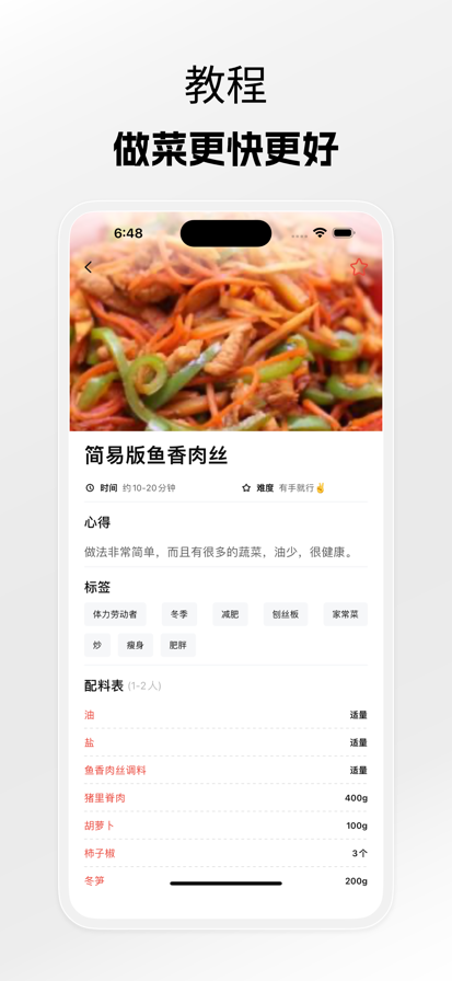 核心特色: • 高效呈现所有用料、用具、步骤,一目了然。 • 精心研发容易上手、不易失败的美味菜谱,比如略有难度的鱼香肉丝、宫保鸡丁,研发团队研究出鱼香汁、宫保汁的简单配比,只要跟着菜谱做,零厨艺也能做出不失手的经典菜肴。 • 所有食材、调料的用量精确到克、毫升,杜绝”适量“、“少许”等令新手头痛的模糊词汇。 • 明确炖煮、炒制等步骤所需时长,避免新手因难以判断食材成熟程度,导致做不熟或者糊锅的问题。 • 保留详细的图文菜谱,也可以只看文字模式,更方便学习完整的烹饪技巧。 • 提供烹饪所需时间、难度描述、菜谱评分等维度,辅助新手做菜谱选择。 更多贴心功能: • 「吃什么」:按照每个人不同的需求,比如早餐、西餐、家常菜、烘焙等分类进行随机吃什么趣味推荐,还有更多惊喜等待你的发现。 • 「收藏」:遇到喜欢的菜谱,可以点击小心心,把它收藏到自己的菜谱,方便下次查看。