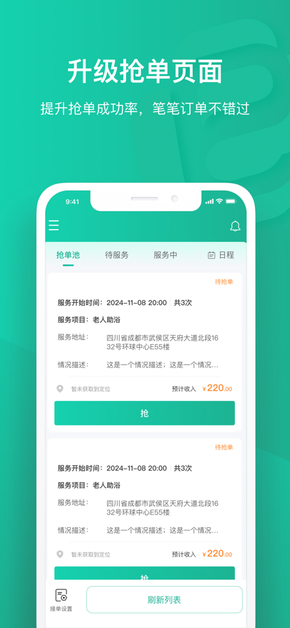 健康生活护理服务平台 加入e护通,开启在线职业新方式 多身份认证,专业服务多面手 自由接单,我的工作我安排 账户透明,收支清晰一本账 工作内容 护士服务,项目包括:上门打针换药、导尿、造口护理、PICC导管维护、术后拆线等基础护理项目;新生儿护理及产后等母婴护理服务;陪诊陪检服务、心血管功能等 疾病筛查服务 护理员服务,项目包括:一对一照护、床上擦浴、协助进食、口腔清洁、排泄护理等;生活护理有造口袋护理、气切护理、留置胃管护理、生活自理能力训练等;临床护理有肢体功能锻炼、翻身叩背排痰、药物喂服、物理降温、心理关怀等 e小店服务,项目包括:按照自己的专长为消费者提供个性化服务;根据用户需求选择适合他们的服务并推荐,提供帮助的同时,赚取推荐费 工作保障 e护通为平台医护人员提供意外险、医责险、第三者责任险保障,免除医护人员后顾之忧。在服务过程中,医护人员可开启并提交服务录音,有效规避医疗纠纷 工作安排 服务人员根据自己的专长和执业领域进行平台角色认证,认证成功后根据自己的工作安排进行接单设置 工作收入 在个人账户可以查看每笔订单的收入流水 联系我们 客服热线:4008-933-120