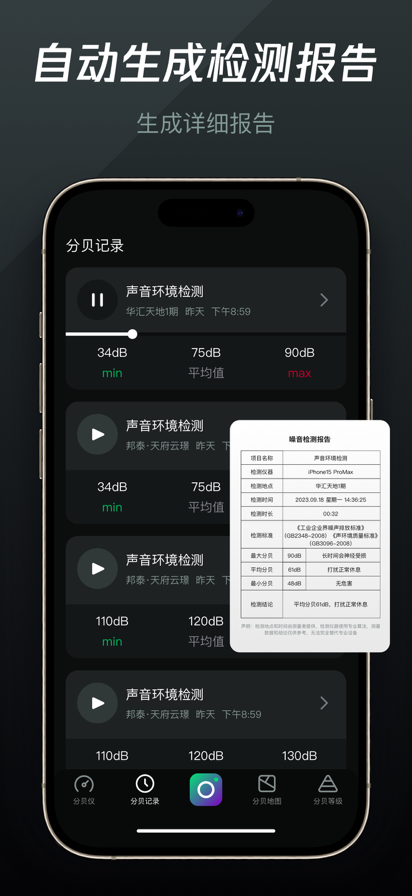 噪音分贝仪是一款多功能的智能工具,为您提供实时、准确的噪音测量功能,并帮助您生成噪音检测报告,保存噪声音频或视频,助您全面了解和管理噪音环境。 主要功能: 实时精确测量:通过APP内置的高效分贝算法和手机麦克风,快速捕捉周围的声音,并实时显示准确的音量分贝水平。无论您是在家庭、工作场所、公共场所或是户外,都能轻松测量噪音情况。 生成噪音检测报告:噪音分贝仪可按需生成详细的噪音检测报告。这些报告包含噪音水平、时间、地点等数据,并以易于阅读的图表和图像方式呈现。您可以通过检测报告全面了解噪音高峰时段和噪音来源,从而采取合适的措施。 保存原始录音、视频:除了测量结果,噪音分贝仪还允许您保存噪声音频或视频。通过保存的音频或视频文件,您可以随时回顾噪音现象,与相关人员进行共享或进行进一步的分析。 轻松操作分享:噪音分贝仪界面简洁易用,操作方便。您可以通过APP内置的分享功能,将测量结果、检测报告、音频或视频直接分享至社交媒体平台或发送给朋友、同事,以便于他人了解您所处环境的噪音状况。 噪音分贝仪是您全面了解和管理噪音环境的理想工具。无论是对于个人用户,还是专业人士如职业卫生工作者、城市规划者等,它都提供了强大的功能和便利的操作,帮助您保护听力健康、改善生活品质。立即下载使用,创造一个更宁静的生活和工作环境! VIP订阅说明: 1、订阅周期:1周、1个月、1年 2、订阅价格:连续包周9元人民币,连续包月28元人民币,连续包年98元人民币 3、VIP特权到期前24小时,自动在iTunes账户扣费,并确定续订费用。 4、取消自动续订:如需取消自动续订,请在到期前24小时,手动在iTunes/Apple ID设置管理中关闭自动续订功能。如未在到期前至少24小时关闭订阅,此订阅将会自动续订。 5、如果提供免费试用期,任何未使用的部分将在用户购买该出版物的订阅时被没收(如果适用) 6、隐私政策:https://noise.appboon.net/agreement/NoiseDecibelMeterPrivacyPolicy.html 7、使用条款:https://noise.appboon.net/agreement/NoiseDecibelMeterUserAgreement.html