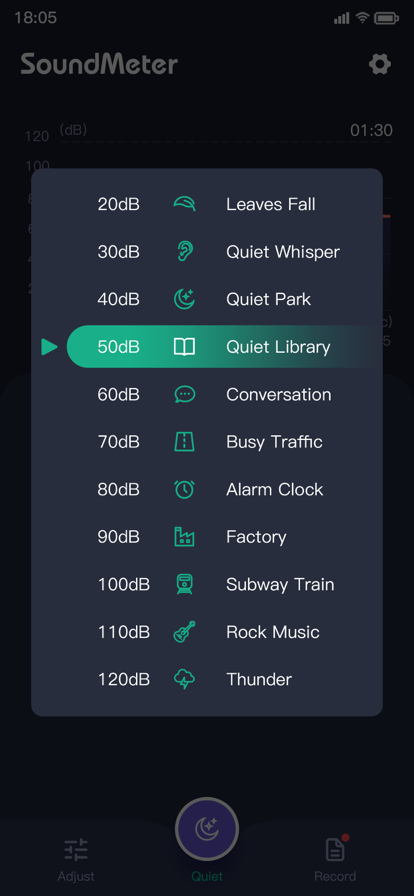 全新的分贝测试仪,更精准的测试引擎,随时随地可以为您提供噪音检测。(但仍无法完全替代专业设备,测量数据仅供参考。) 【==App特性==】 --微调校准可调 --响应频率可调 --提供详细记录和数据报告 【==分贝等级表==】 0-20dB 极静,几乎感觉不到 20-40dB 安静,轻声交谈 40-60dB 一般,普通室内说话 60-70dB 吵闹,大声说话 "70-90dB is noisy and damages nerve cells" = "70-90dB 很吵,损伤神经细胞"; "90-120dB extremely noisy, injuried hearing" = "90-120dB 极吵,损伤听力";