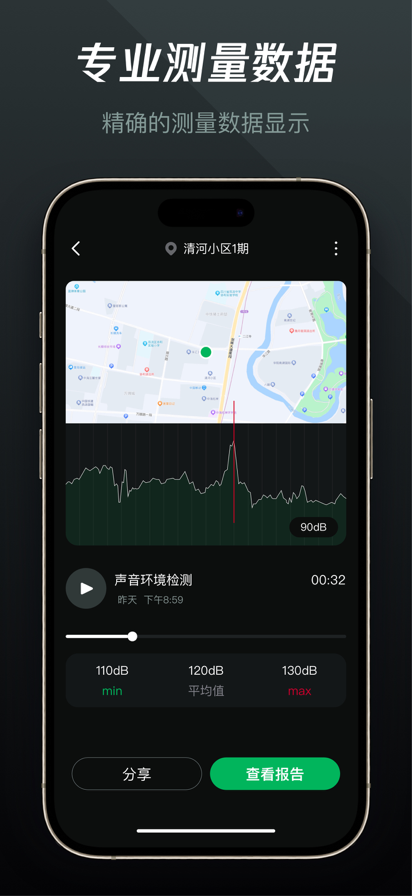 分贝测试仪App可以随时随地为您提供噪音检测参考,同时提供检测点位置信息。还可以为您导出音频文件进行随时分享。 虽然我们提供了尽量精准的测量数据,但是此App仍然不能完全代替专业测量设备,紧紧用于私人用途参考。