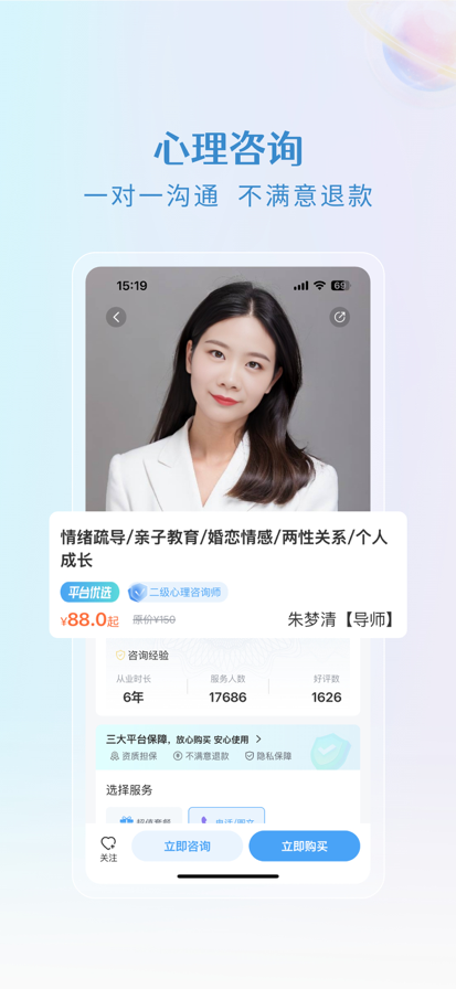 壹心理,14年专业心理咨询品牌,国内专业心理健康服务平台。 提供大众心理服务(心理咨询、即时倾诉、心理测评)、心理职业培训、心理体检、组织(学校)心理服务等在内的多形态、立体化综合性心理服务。 壹心理是一个坚持长期价值的团队,创业14年,专注于心理健康的全民普及,为中国大众的内心烦恼提供可靠解决方案,让专业心理服务可及、可信、可持续。目前壹心理用户覆盖147个国家,4800万用户在壹心理获得心理学帮助。壹心理团队一直在打磨可以放心推荐给朋友和家人的心理服务~ 在壹心理APP咨询,我们做到: 【专业】 每一个壹心理入驻心理咨询师都通过5层严格筛选并通过行业专家团队的审核,入驻筛选通过率仅2%。咨询师70%以上拥有硕博学历,提供中英法日韩等多语种咨询服务。 【可靠】 壹心理作为国家心理测评服务标准起草单位、中国心理服务机构联盟理事单位,凭借14年的专业经验,已为全球137个国家和地区的超过4000万华人与留学生提供了心理服务。 【安心】 壹心理拥有自主研发的国家专利保护技术,全程保障咨询安全,让用户可以放心说出自己心底的故事。 【全面】 壹心理心理咨询覆盖300多个咨询细分方向,为用户提供个人成长、婚姻情感、心理健康、人际关系及亲子教育等多个领域的专业心理咨询服务。 在壹心理 App,你可以: 【认识你自己】 通过趣味测评、心理书籍、冥想、免费课程等心理工具,陪伴你的成长,丰沛人生体验,传递生活的勇气和力量; 【入门心理学】 通过科普文章、互助问答、精选专栏等形式,了解心理学知识、社会热点的心理学角度分析,以及大众关心的情感、家庭、人际等话题; 【解决内心困惑】 提供专业的入驻咨询师、倾听师。通过资质审核、咨询时长和督导体验经历把关、现场面试等方式,建立了稳定并严格的审核标准。 并给大众提供了多种渠道来『了解咨询』、『体验倾诉』、『获得指导和服务』。 【成为心理咨询师】 如果你想成长为一名具有执业胜任力的心理咨询师,可以在壹心理平台报名『朝阳计划』咨询师培养项目,系统学习心理咨询的基本功和专业技能,一站式提升胜任力。 【成为助人倾听师】 如果你想成为专业的助人者,可以在壹心理平台报名『心理倾听师』培养项目,通过专业培训快速入门并实践,运用心理学技巧赋能自己和生活的各个方面。 【心理学人的互动交流】 壹心理通过『心榜』、『咨询师之家』、『问答成长社区』等,帮助普通爱好者/心理学初级人员,成为优质答主、精华答主、专栏作家……给心理从业者提供一个交流互动、互相支持的平台。 在产品使用过程中有任何问题,请联系我们: 客服微信:yixinliyhfk 客服电话:400-7889001,可根据语音提示转接 电子邮箱:qudao2@xinli001.com 无论你在哪里,无论你面对什么,请记得:世界和我爱着你!