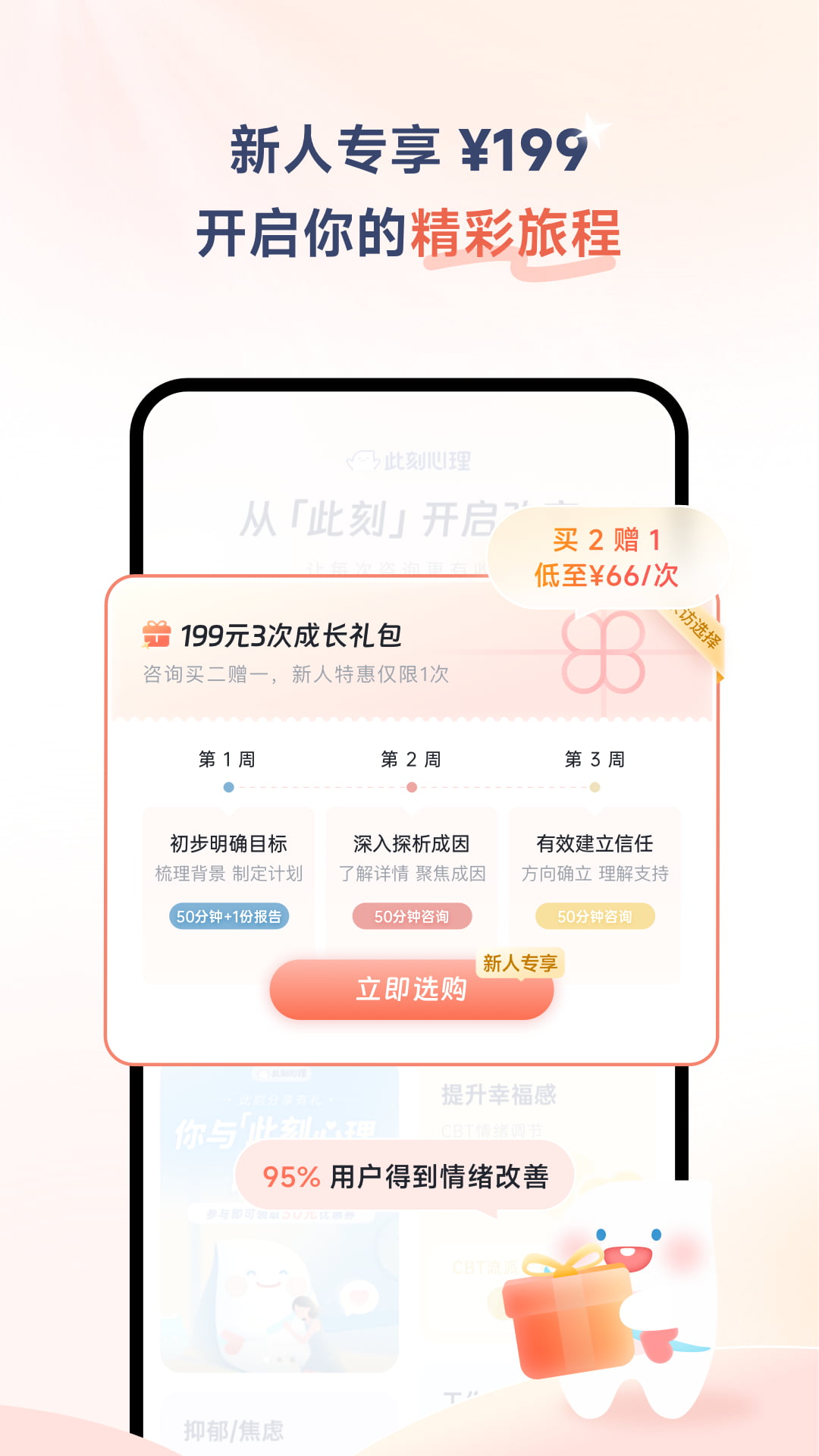 此刻心理App,14年心理咨询品牌壹心理旗下的心理咨询服务平台——专为年轻人打造,提供专业、便捷、高性价比服务,助力自我成长。<br><br>为什么选择此刻心理?<br>——如果你被困在原生家庭的茧里<br>这里有700+严选咨询师,温柔托举带你重建自我边界;<br>——如果你在职场迷雾中看不清方向<br>这里有专业焦虑疏导,带你迅速成长为职场新人,斩获心仪offer;<br>——如果你在学业与自我的天平间摇摆不定<br>这里有学生成长支持,带领青少年找到个性成长的动力。<br><br>此刻心理的核心优势:<br>1.<br>性价比之选,破除心理咨询高价壁垒<br>新人特权:首单199元享3次50分钟1v1咨询,均价低至66元/次<br><br>2.<br>严选700+专业咨询师,精准匹配年轻群体<br>•<br>三重严筛:100%持证(国家二级咨询师/心理治疗师)+200+学时系统培训+季度督导考核;<br>•<br>共情年轻群体:70%咨询师专注解决学业压力|人际矛盾|面试焦虑|职场倦怠等痛点;<br>•<br>智能匹配系统:自创C-NIP偏好问卷10分钟智能匹配,不满意可免费更换<br><br>3.<br>多元化议题覆盖,包容每一份“难以启齿”的困扰<br>•<br>情感成长:恋爱情感困惑、婚姻危机、原生家庭创伤修复;<br>•<br>身份探索:LGBTQ+群体自我认同、性别焦虑支持;<br>•<br>职场进阶:沟通障碍、领导力焦虑、职业规划迷茫;<br>•<br>情绪急救:抑郁情绪调节、失眠陪伴、社交恐惧突破<br><br>可帮助群体: <br>·无服用精神类药物历史; <br>·无自伤意愿和行为; <br>· 敢于了解、改变自己,并有此愿望和动机。 <br><br>加入此刻心理,给自己一次认真变好的机会!