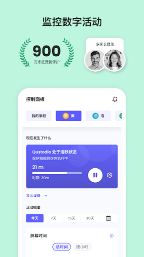 Qustodio 家长控制应用荣获《PC Mag》编辑推荐奖,通过每日屏幕使用时间限制、应用程序拦截、儿童定位追踪、AI 搜索和短信警报、社交媒体监控、色情内容拦截等功能,让育儿更轻松。<br><br>- 屏幕时间限制:在设定时间结束后自动阻止设备使用<br>- 家庭家长控制和家庭模式:跟踪和监控孩子在互联网上访问的内容,包括不当和成人内容过滤等<br>- 家庭定位器连接GPS跟踪:跟踪孩子的电话并向您发送其GPS定位<br>- 应用程序监控和洞察: 监控孩子的网络使用情况,并提供应用程序洞察,例如应用程序内容描述和适合孩子年龄的替代方案。<br>- AI 短信和搜索警报: 监控可疑的浏览活动、危险的短信和社交信息,并发送提醒警报。<br><br>首先将 Qustodio家长控制应用下载到您的设备上,然后将Qustodio儿童配套应用下载到孩子的设备上。通过这两个应用程序,您就可以在关联的移动设备、平板电脑或台式设备上无缝管理孩子的每日屏幕时间使用情况,适用于安卓、iOS和其他主要操作系统平台。<br><br>Qustodio免费版家庭屏幕时间限制应用程序(监控1台设备)<br><br>✓使用屏幕时间限制工具设置和管理每日屏幕时间限制<br>✓阻止网站或类别(如游戏、赌博、色情等)<br>✓网站、搜索和应用监控<br>✓通过安全搜索阻止成人或色情网站<br>✓阻止不受支持的浏览器<br>✓高级报告(7天历史记录)<br>✓家庭定位器模式、GPS跟踪器、屏幕时间限制警报<br><br>Qustodio高级版家庭屏幕时间应用程序(监控5、10或15台设备)<br><br>除享受Qustodio免费版应用的所有功能外,还包括:<br><br>✓ 接收搜索警报<br>✓ 接收短信警报。<br>✓接收社交监控警报。(适用于 WhatsApp、Instagram 和 Line)<br>✓全新YouTube监控<br>✓全新家庭定位器连接地理位置跟踪<br>✓按应用程序阻止(按具体应用而不仅限于类别阻止)<br>✓30天屏幕时间历史报告<br>✓激活SOS按钮即可给家庭成员发送警报<br>✓优先家长控制支持<br>✓优先使用新功能<br>✓可关联更多设备,获取完整的家庭模式和家庭定位器<br>✓安装Qustodio即可监控iOS、Windows、Mac、安卓或Kindle设备上的屏幕时间<br><br>全新的家庭定位器是Qustodio家长控制&屏幕时间限制应用中内置的移动GPS跟踪工具,使您能够查找家庭电话、在家人外出时定位他们的位置、添加喜欢的地方以及共享位置。<br><br>选择 Qustodio 的基础家长控制套餐以使用部分功能,或升级到高级套餐以使用所有功能<br><br>如何使用Qustodio家长控制应用保护、阻止和监控屏幕时间:<br>1 –首先将 Qustodio家长控制应用下载到您的设备上(通常为手机或笔记本电脑),创建帐户或登录<br>2 –然后在要监管的设备上安装儿童应用Qustodio<br>2 –登录并按照快速设置说明进行操作<br>3 –设置完成后,应用将自动阻止不当网站<br>4 –如需监控活动和屏幕时间,请在家长设备上使用Qustodio家长控制应用或登录在线Qustodio家庭屏幕时间控制面板(https://family.qustodio.com)<br><br>常见问题解答:<br>• Qustodio家长控制和屏幕时间限制应用是否支持安卓 8(Oreo): 是。<br>• Qustodio屏幕时间限制应用是否可以在安卓以外的其他平台上运行? Qustodio适用于Windows、Mac、iOS、Kindle和安卓平台。<br>• 您提供哪些语言支持? Qustodio支持英语、西班牙语、法语、意大利语、葡萄牙语、德语、<br>荷兰语 日语和中文。<br><br>如需帮助,请联系:https://www.qustodio.com/help 和 support@qustodio.com<br><br>备注:<br>该应用使用设备管理员权限。这将防止用户在您不知情的情况下卸载Qustodio家庭屏幕时间应用。<br><br>该应用提供无障碍服务。目的是创造卓越的设备使用体验,帮助行动不便的用户设置适当的访问级别以及监控屏幕时间、网络内容和应用程序,让他们在降低风险的同时享受正常的生活。<br><br>故障排除说明:<br>华为设备使用者:为了正常使用Qustodio,请务必禁用省电模式。