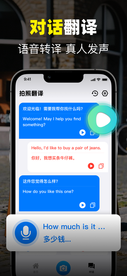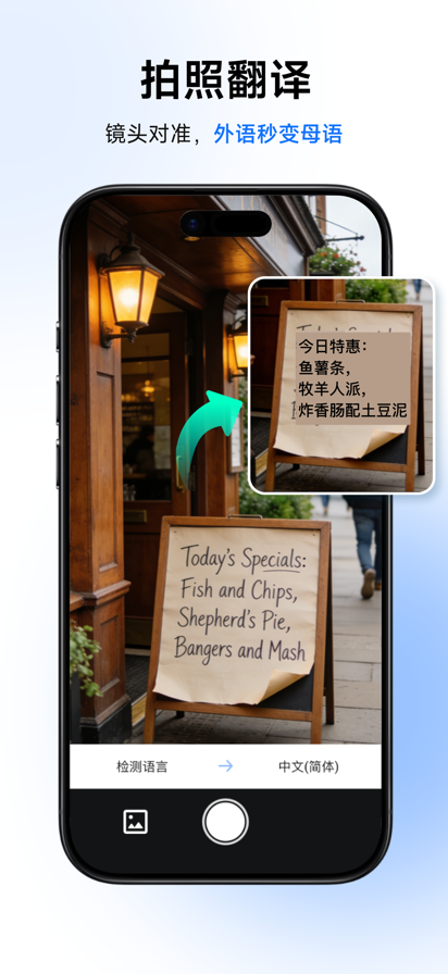 拍照翻译软件是一款功能强大且便捷实用的语言工具,致力于打破语言障碍,帮助用户轻松实现跨语言交流。 文本翻译:支持多种语言的互译,无论是日常交流的短句,还是篇幅较长的商务合同、学术论文等,都能精准翻译。 语音翻译:该功能让交流更加自然流畅。开启语音翻译后,用户说出源语言内容,APP 会迅速识别并转化为目标语言语音播放出来。 对话翻译:以1对1对话的形式进行翻译,记录每次对话的内容,让双方可以畅快无阻碍的交流。 离线翻译:支持下载离线语音包,在无网络的状态也可以进行翻译。 隐私政策 https://scnm7l5qvgp7.feishu.cn/docx/HozfdwOtGoLJYZxtAQXcfnQmnBh?from=from_copylink 使用条款 https://scnm7l5qvgp7.feishu.cn/docx/Lka3dYrq4oeP5hxf3GOcwdMUnVd?from=from_copylink