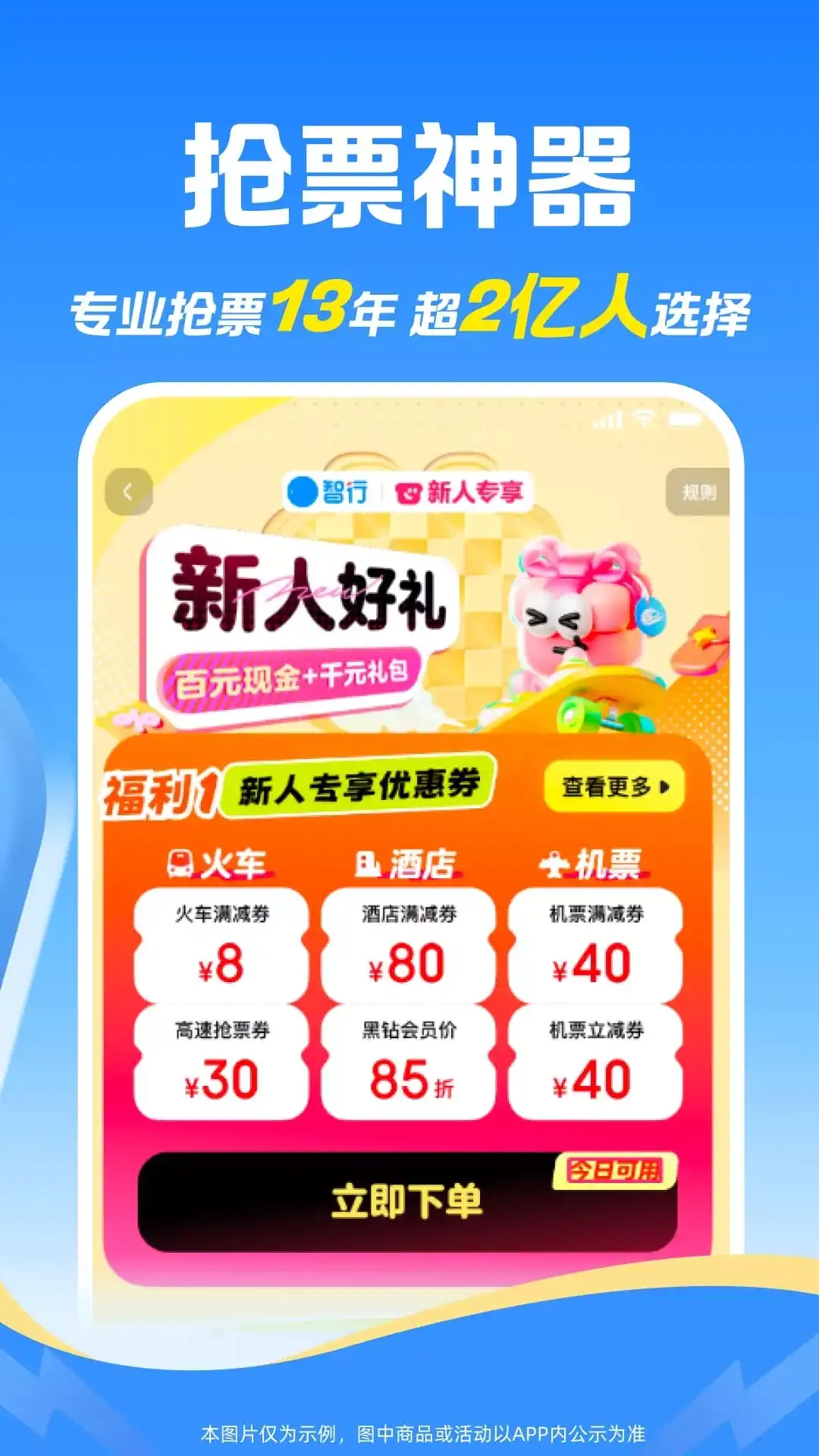 智行火车票(12306官方出票)-火车票、机票、酒店、汽车票、门票、船票一站式出行预订平台。 出行神器,提供火车开售时间、正晚点、候补人数查询等一站式出行服务,功能全面助您旅途顺心! 主要产品与服务: 【火车票】 [线上选座] - 在线选择心仪座位,下铺、靠窗随心选。 [免费车票] - 积分兑车票,0元免费坐火车。 [自动抢票] - 可提前预约下单,开售时自动秒杀出票;不仅抢候补,也能抢余票。 [24小时抢] - 可全天24小时抢票,有专人帮抢,成功率高,抢不到就敢赔。 [抢票福利] - 靠窗、下铺免费抢,学生还有全年免费抢票福利,抢不到免费升坐席。 [余票捡漏] - 各条线路隐藏余票一键检索,免费监控,即刻解决无票难题。 【特价机票】 买机票,先来智行比价,全球低价尽在智行。 【低价酒店】 独家功能,低价监控,有房监控,平台还可以帮您跟商家还价,低价不错过。