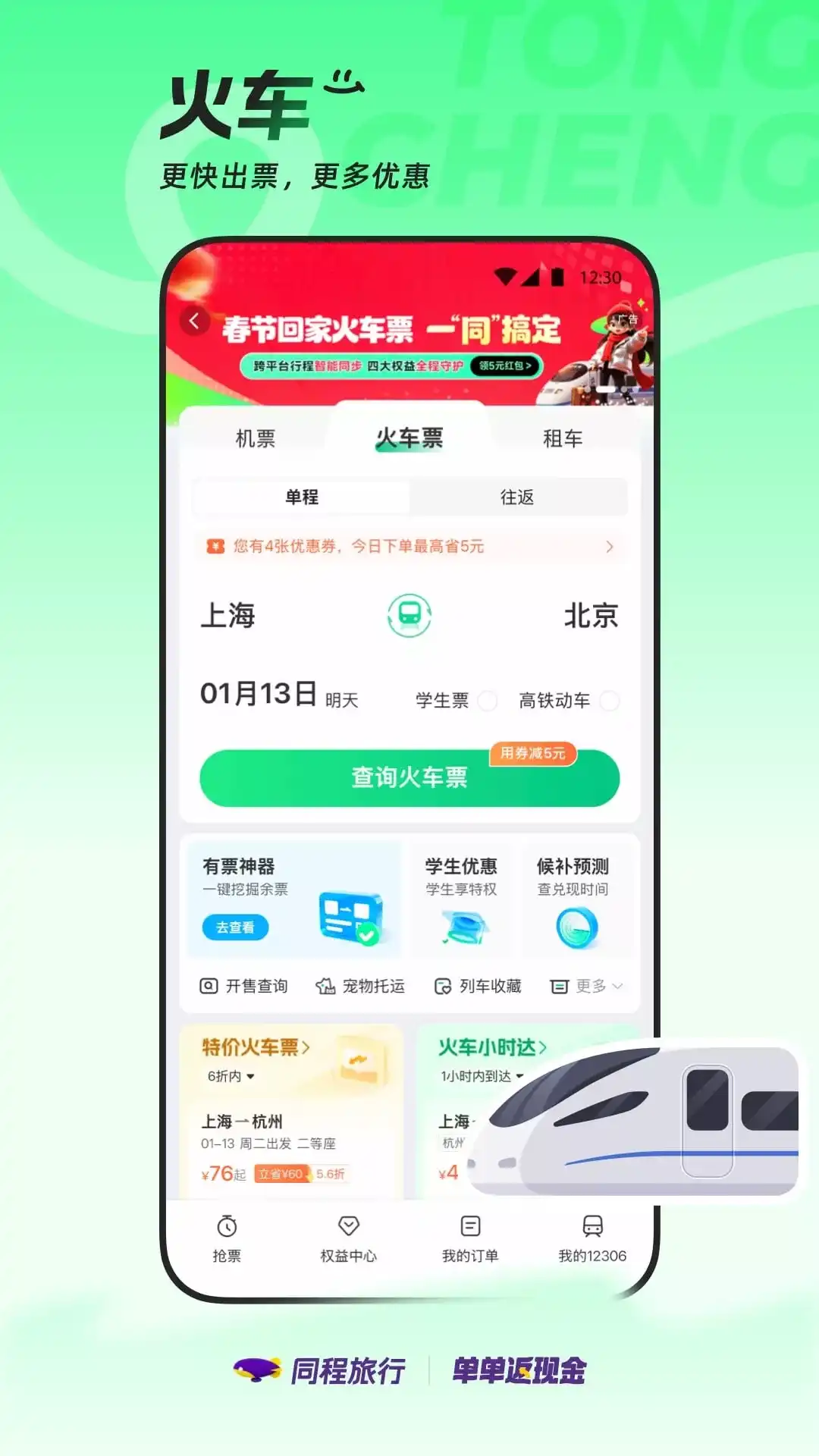 中国铁路出品,人民铁路为人民,买火车票就用铁路12306!铁路12306网站(含手机客户端)是中国铁路唯一官方火车票网络售票平台,从未授权任何第三方平台发售火车票。 我们的特色: 【售票无加价】不收取加速包费用,不捆绑保险销售,不收取会员费,让您购票放心。 【信息更准确】晚点、停运信息,列车出发、到达信息,车厢、车型信息,第一时间获知,让您出行安心。 【功能更全面】火车票、机票、汽车票、网络订餐、酒店住宿、旅游等近百项功能,让您旅行无忧。 【服务更温馨】满足老年人的大字版,满足视障等特殊人群的无障碍版,让您使用便捷。 主要产品及服务: 【火车票预订】 1.无票候补。车票售完不用慌,无票候补帮您忙。提交候补需求,当因退票、改签或新增列车等产生可供发售的车票时,自动为您出票。 2.选座选铺。喜欢靠窗看风景?喜欢靠过道便捷?喜欢上铺清净?喜欢下铺方便?选座选铺一键指定心意座/铺位。 3.智能中转。没有直达方案?中转服务智能为您推荐换乘方案。 4.车站大屏。查看列车出发、到达信息,让您轻松掌握行程,送站接人更加便捷。 【机票预订】 航司官方直营店入驻,官方机票服务,购票更安心,出行有保障。 【汽车票预订】 覆盖全国随时出发!提供国内公路客运信息、汽车站、线路时刻的查询及汽车票预订服务。 【联运服务】 提供空铁公水多交通方式一站式购票及信息查询服务,省时省心,出行更多选择。 【出行服务】 提供高铁订餐、酒店预订、约车接送站、铁路游、景区门票预订、铁路商城、出行保险等服务,吃住行游购娱,一款APP满足您的出行需求。 【温馨服务】 提供临时乘车证明、重点旅客预约、遗失物品查找等便捷服务功能,让您出行无后顾之忧。 【会员服务】 提供会员权益及支持使用积分兑换车票等相关服务。 更多信息请关注 微信公众号:铁路12306