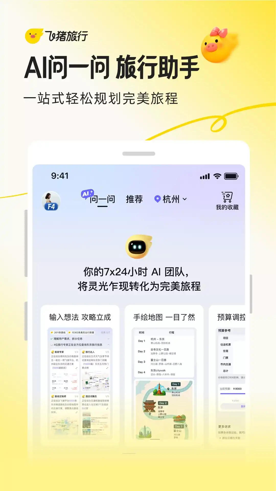 飞猪是阿里巴巴集团旗下旅行品牌,提供机票、酒店、火车票、汽车票、景点门票、用车、周末游、跟团游、自由行、自驾游、邮轮、旅游度假产品任您选!精选攻略、出行保险,旨在为您提供优惠、便捷、高性价比的出行服务。 [精彩活动] 1.「新人大礼包」首次下载飞猪App,即享百元飞猪出行大礼包; 2.「特价机票」每周四福利日低至2折,1元飞世界; 3.「特惠酒店」五星酒店五折住; 4.「飞猪会员日」会员可直接对等成为国内外五星酒店、国内各大知名酒店集团的银卡、金卡、白金卡,并尊享该等级所有会员权益; 5.「飞猪特卖」全网高性价比旅行商品,每天等你来; [特色服务] 1.「周边好去处」、「全球第一站」,分享旅行见闻,带你发现更多精彩; 2.享受先行赔付的「放心飞」服务,航空公司标准的退改签服务; 3.专享「信用住」酒店,免押金、免查房、免排队; 4.随时查看全球热门「目的地」攻略,旅游指南、行程游记、景点、美食、购物全掌握; 5.「领里程」当钱花,好货兑不停。