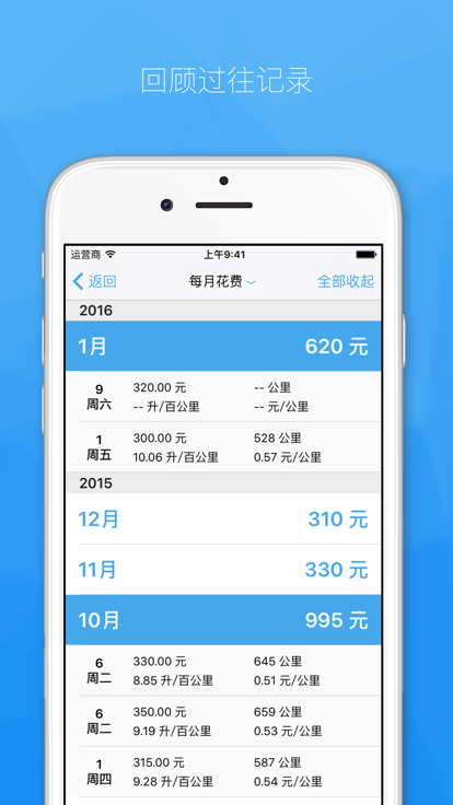 人类从一开始就记录和储存数据,人们用上百种方法记录时间、记录开支、记录生活。 今天,我们同样可以把加油这件小事做得更极致一些。 - 你有一辆爱车,每次加油你都会记上一笔。最近跑了个长途,该去保养了。 - 你有好多辆车,一辆开着上班、一辆周末自驾游、还有一辆要去西藏。没问题,通通可以放在一起。 - 最近又添了一部土豪金,之前的记录怎么办?没关系,iCloud 除了备份还能同步。 - 无论如何,请勿在加油站使用手机。抬手点亮 Apple Watch,加完,保存,走你。