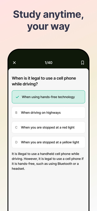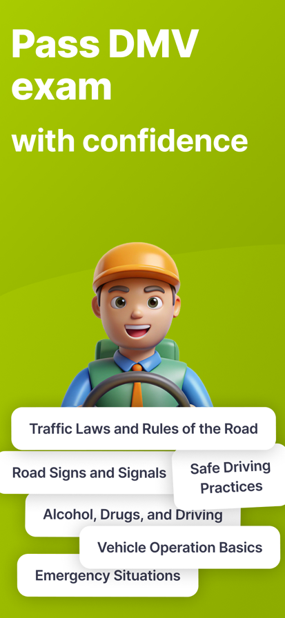 Ace Your DMV Exam with Confidence! Prepare smarter, not harder with the ultimate DMV Exam Prep app. Whether you're a first-time driver or renewing your license, this app gives you everything you need to succeed. Be ready, be confident, and pass your DMV written test on the first try. Key Features: *Up-to-Date Questions: Practice with a massive library of questions that reflect the latest DMV test standards for your state. *Detailed Explanations: Understand every answer with clear, concise explanations to reinforce your learning. *Covers All Major Courses: Get comprehensive coverage of Road Signs, Traffic Laws, Defensive Driving, Safe Driving Practices, and more. *Various Test Modes: Choose from Missed questions test mode, Quick test, or focus on Saved questions — study your way. *Track Your Progress: Monitor your daily improvement, review performance stats, and stay motivated. *********** Premium access To access all the premium features and content, you need to subscribe or pay once for lifetime access. The cost of the purchase is charged to your iTunes account. Subscriptions automatically renew and are billed at the rate and period you choose based on your subscription plan. User accounts are charged for auto-renewal within 24-hours prior to the end of the current period. Subscriptions may be managed and auto-renewal may be turned off in iTunes Account Settings after purchase. Any unused portion of a free trial period, if offered, will be forfeited when the user purchases a subscription to that publication, where applicable. Privacy Policy: https://apps-by-konstantin.com/policy Terms of Use: https://apps-by-konstantin.com/terms