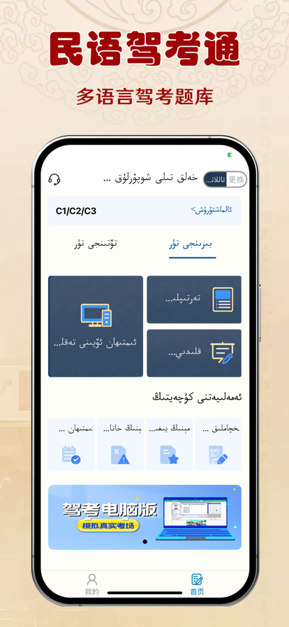 民语驾考通是一款面向多民族用户的驾考理论辅助学习软件,内置藏文、维吾尔语、哈萨克语、蒙古语、汉语五种语言版本,覆盖机动车驾驶人科目一、科目四完整题库,帮助不同语言背景的用户高效备考。 多种语言,自由切换 用户可根据自身语言习惯,在应用内一键完成语言切换。所有语言版本的题目内容、功能界面、操作提示均经过专业翻译与严格校对,确保表达准确规范,让用户在熟悉的语言环境中准确理解交通法规与驾驶知识。界面设计简洁清晰,菜单、题目、解析同步切换,无需繁琐设置,上手即用。 题库精准,实时更新 本应用收录完整的机动车驾驶人理论考试题库,涵盖科目一、科目四全部考点,并依据最新交规实时更新。题库覆盖小型汽车、摩托车、大型客车、货车等多种准驾车型,满足不同用户的备考需求。 多种练习模式,高效备考 民语驾考通提供多种学习模式,满足不同阶段的备考需求: -顺序练习:按章节逐题学习,适合系统掌握知识点 -随机练习:打乱题目顺序,检验综合掌握程度 -速成500题:精选500道重点常考题型,学会1题顶3题,快速通关 -考场模拟:严格按照真实考试的题型比例、题量及时间限制进行全真模拟,帮助提前适应考试节奏 -错题与收藏:自动收录错题,支持收藏题目,反复练习,精准攻克薄弱环节 民语驾考通将持续更新题库内容、优化功能体验,为多民族用户提供规范、准确、便捷的驾考学习工具。