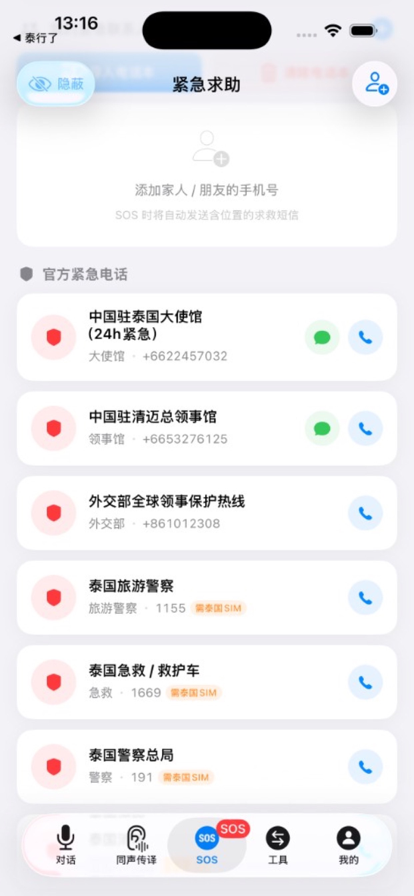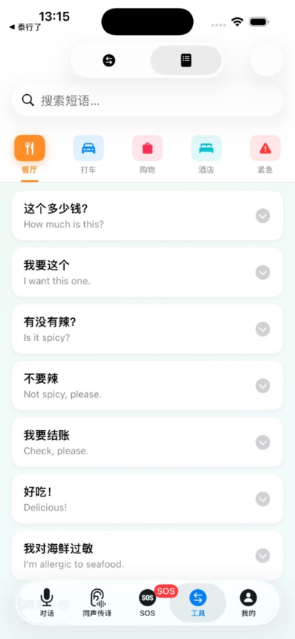 泰行了是一款面向泰国旅行场景设计的随身助手,提供中泰英对话翻译、同声传译、拍照识别翻译、SOS 紧急求助、实时汇率换算和旅行常用语等功能。