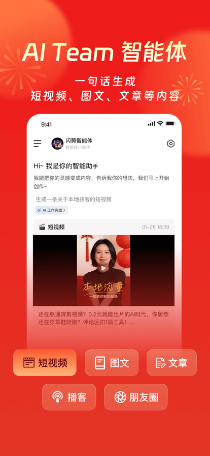 闪剪 AI 是新一代的 AI 创作工具,你只要像平时聊天一样,说出你的创意,哪怕就一句话,就能生成视频、图片、音乐、文章等自媒体内容,轻松打造你的个人影响力。 核心亮点 【特效模板】玩法多样,灵感不断,一键套用,年味十足。 【AI 生视频】上传图片 + 一句话,就能轻松做出广告大片。 【AI 生图】一句话做图,轻松搞定电商、营销、新媒体等素材。 【AI 音乐】无需乐理,讲出你的故事,AI 为你写歌谱曲。 【AI Team 智能体】 只需一句话,就能轻松搞定短视频、图文、文章等内容。每个人都能成为传播者,每个人都值得被看见。 ———————还有更多精彩玩法——————— 【定制数字人】 上传 30 秒视频或者一张图片,就能 1:1 复制你的形象和声音,定制专属的数字人来拍摄短视频。现在可以无限次定制数字人,性价比超高! 【直播快剪】 导入直播链接就能实时录制直播,还能自动把直播切成精彩片段,生成配有字幕、花字、音效和转场效果的短视频,一键发布到平台带货。 【声音克隆】 支持克隆 10 种以上外语和国内方言的声音,简单录下自己的声音,就能一键克隆,轻松制作“本地化”短视频。 自动续费订阅说明 订阅服务:自动续费月会员 付款:用户确认购买并付款后记入 iTunes 账户 续订:苹果 iTunes 账户会在到期前 24 小时内扣费,扣费成功后订阅周期顺延一个订阅周期 取消续订:如需取消续订,请在当前订阅周期到期前 24 小时以前,手动在 iTunes / Apple ID 设置管理中关闭自动续订功能 【隐私政策】https://static.shanjian.tv/shanjian/ios_privacy_policy.html 【用户协议】https://static.shanjian.tv/shanjian/ios_user_agreement.html