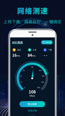 一键测速,帮助您轻松了解网络状况,支持宽带测速和WiFi测速 【一键测速】:查看手机网速,手机网络、Wifi都可使用,快速、准确获得网速测试结果; 【蹭网检】:被其他人盗用您的网络?一键检测连网设备,快速进行网络扫描,贴心保护隐私 【信号测试】:检测Wi-Fi信号强度,帮助您寻找周围更强信号; 【网络诊断】:突然断网?检测当前网络连接状况,一键诊断各种网络问题; 【网速排名】:显示用户网速排名,查看自己的网速名次。 【流量监控】:监控流量数据,准确预警流量,避免多的流量开支; 让测速成为你的移动网络、无线网络测试智能助手。