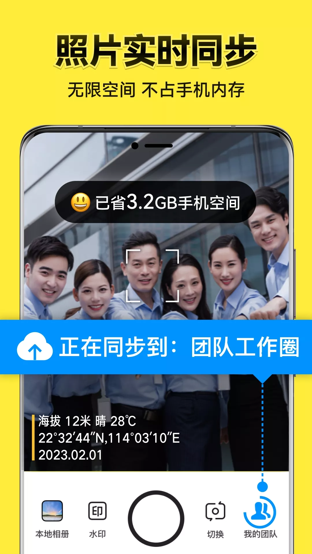 拍照片、拍视频,都能加水印。 7000万人都在用! 【适用场景】 工作拍照留痕、团队考勤打卡、工程管理、外勤拍照、综合执法执勤、取证拍照、旅行拍照、宝宝成长拍照、记录美好生活都在用! 【丰富的水印选项】 时间、地点、天气、海拔、风速、湿度、经纬度、方位角、倒计时、农历、星座、年龄、节日等 【专业的水印模板】 *考勤打卡水印: 时间地点无法修改 *工程水印: 项目巡检、物资采购、材料验收、劳务用工等工程专属模板 *自定义水印: 水印上内容选项自由开关,自由添加水印内容行数、修改颜色、添加图片logo等 *品牌宣传水印: 添加品牌图、联系方式、全屏防盗水印 还有执勤水印、亓道经纬度水印、农历水印、宝宝出生天数记录水印等。 【强大的团队功能】 *拍照、拍视频,自动同步到团队 自动生成考勤报表,提高团队管理效率 *团队相册 按水印/水印内容/时间等对照片快速分类,创建不同团队相册 *照片搜索 可通过水印文字搜索照片,快速找到需要的照片 *照片同步机器人 团队拍照,可自动同步钉钉群、企业微信群。 *电脑端管理后台 在电脑上管理团队照片,自由搜索照片内容、分类存储; 自动生成拍照路线,在地图上查看拍照地点和路线。 *一键分享 微信群、QQ群、朋友圈、微博一键分享,方便快捷,工作生活两不误。 *自拍美颜,高清滤镜 自拍,拍美食,拍萌娃,拍风景,随手拍都是大片。 【联系方式】 问题反馈:feedback@huihaiyinhe.com 商务合作:bd@huihaiyinhe.com 版权声明: 今日水印相机APP受《中华人民共和国著作权法》、《中华人民共和国商标法》、《中华人民共和国专利法》、《计算机软件保护条例》、《中华人民共和国反不正当竞争法》等相关法律法规保护。任何企业或个人未经授权不得使用。如擅自使用本公司及关联方享有著作权、商标权、专利权的相关内容,包括但不限于实施复制、抄袭、修改今日水印相机APP特有的水印模板、官方水印LOGO和电子出版物等内容,我们将依法追究行为人的刑事责任、民事责任和行政责任。